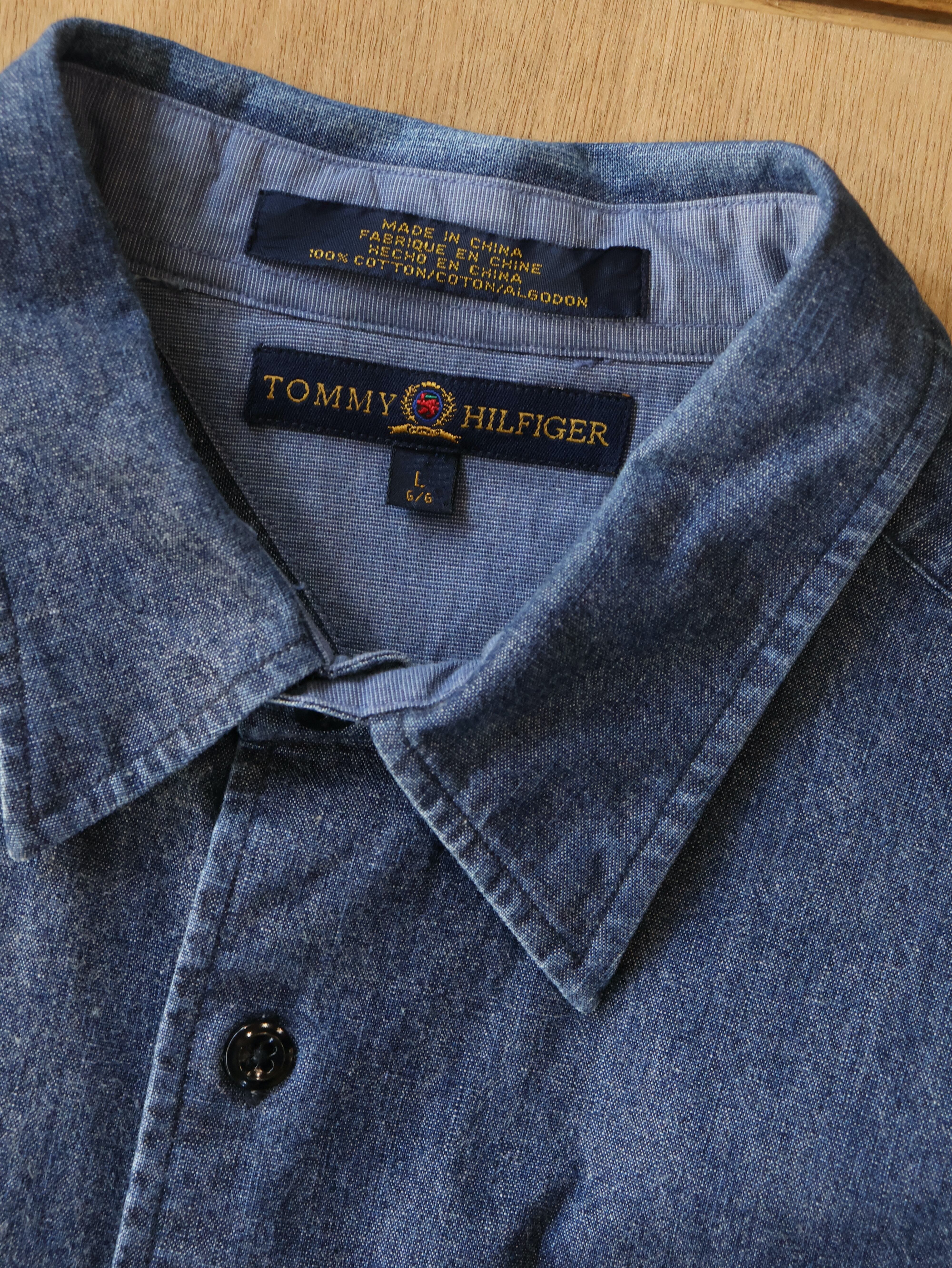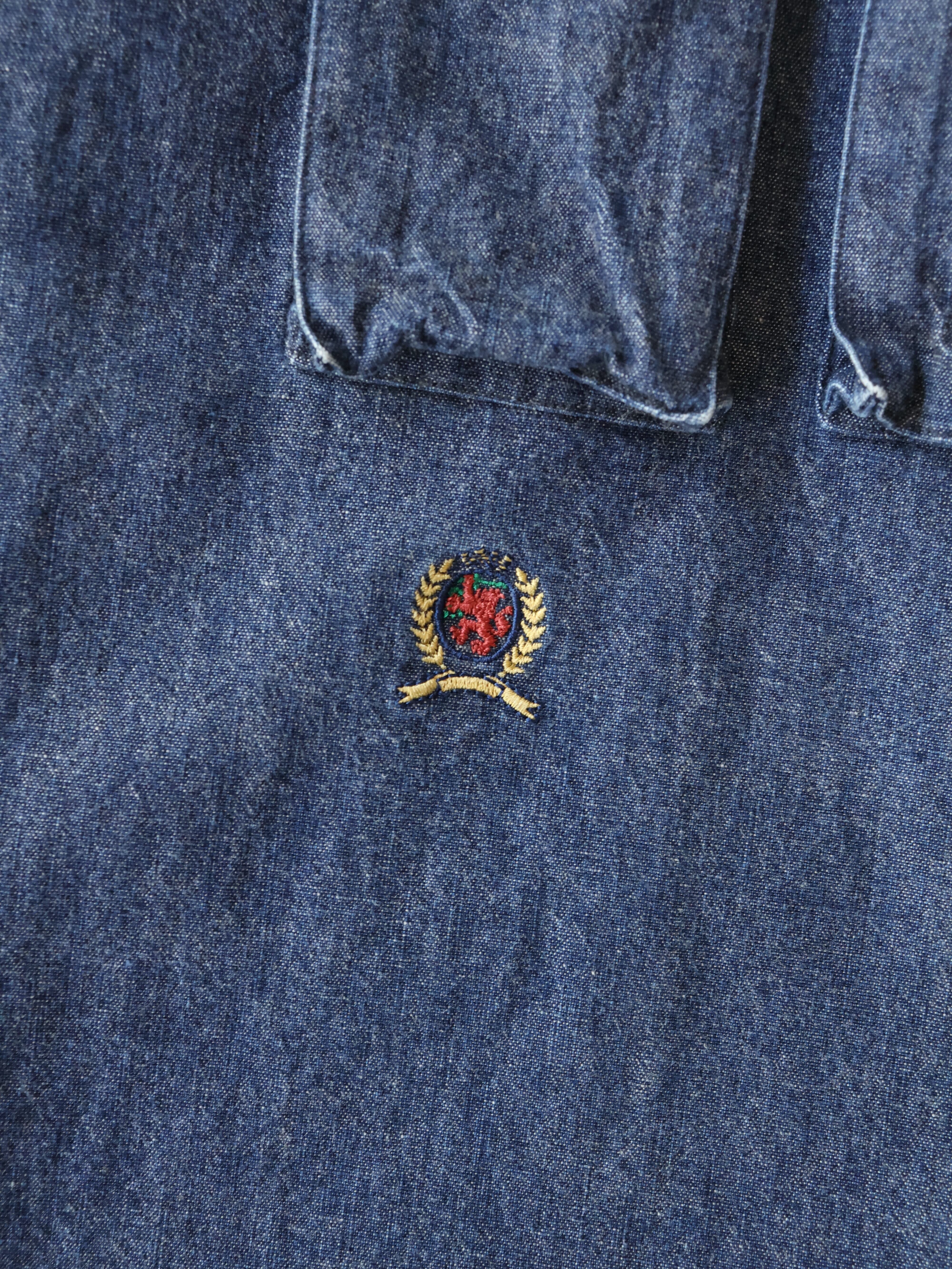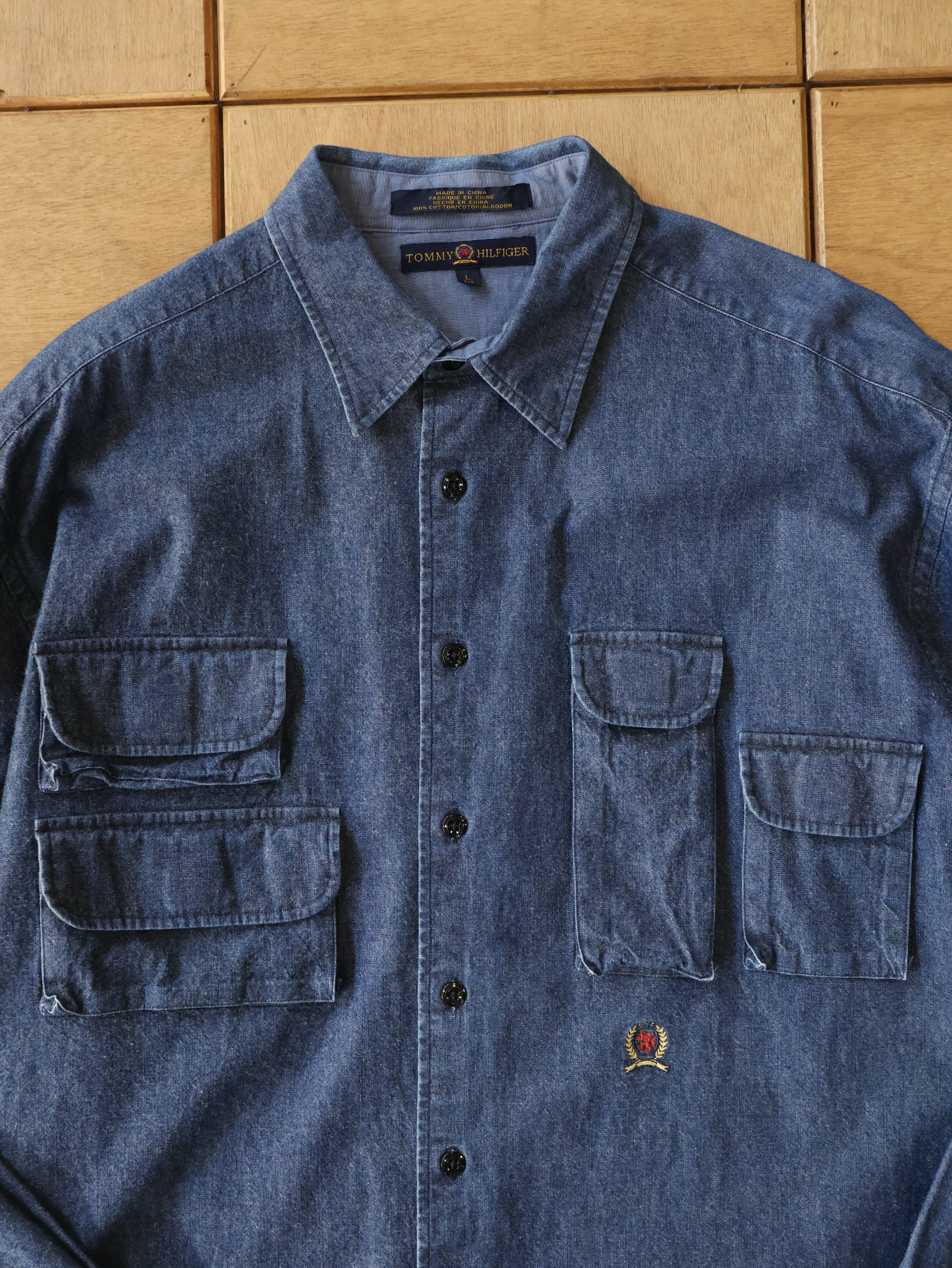 90s TOMMY HILFIGER chambray fishing shirt 表記L インディゴ シャンブレー フィッシングシャツ トミーヒルフィガー【0010】