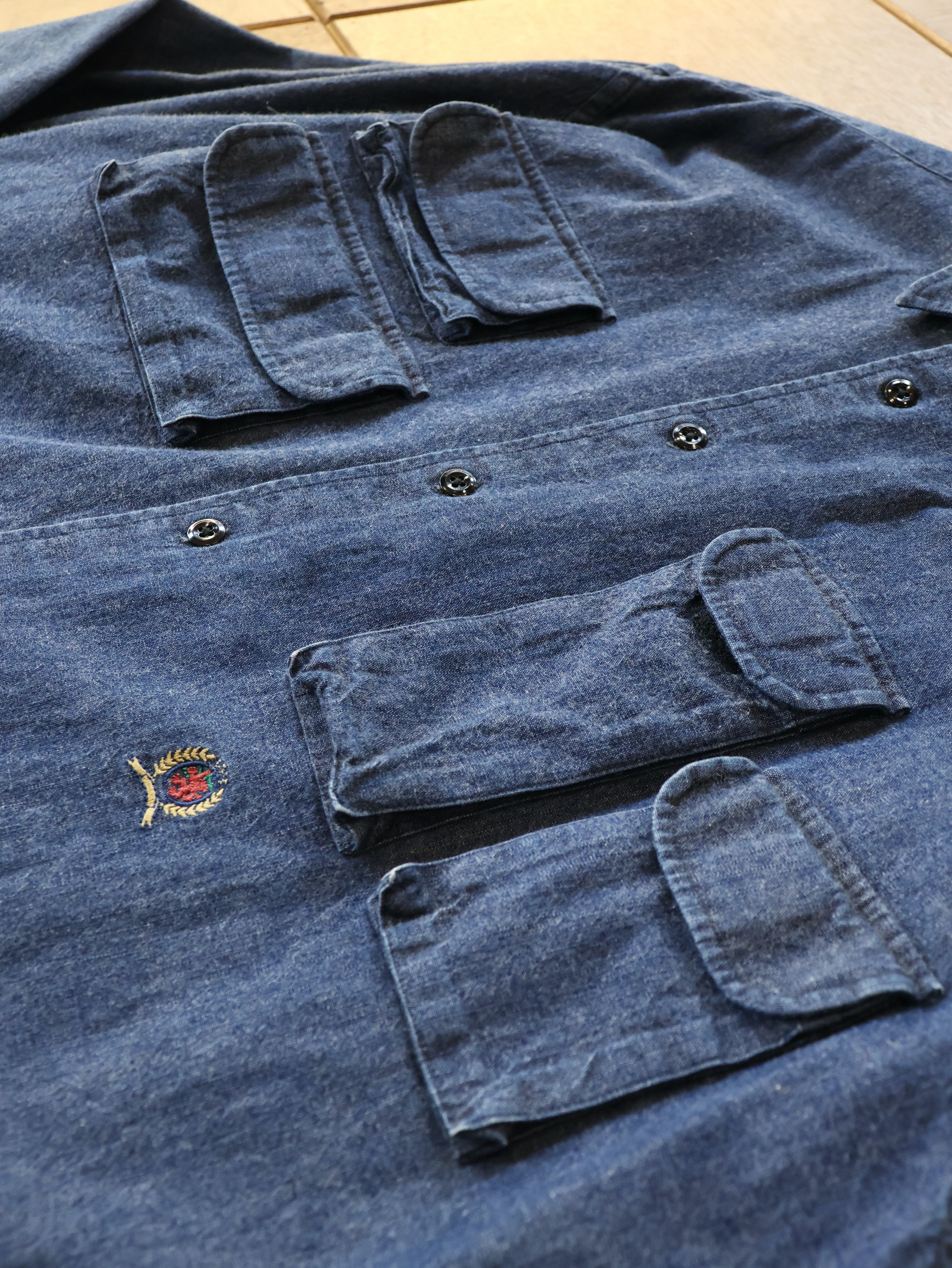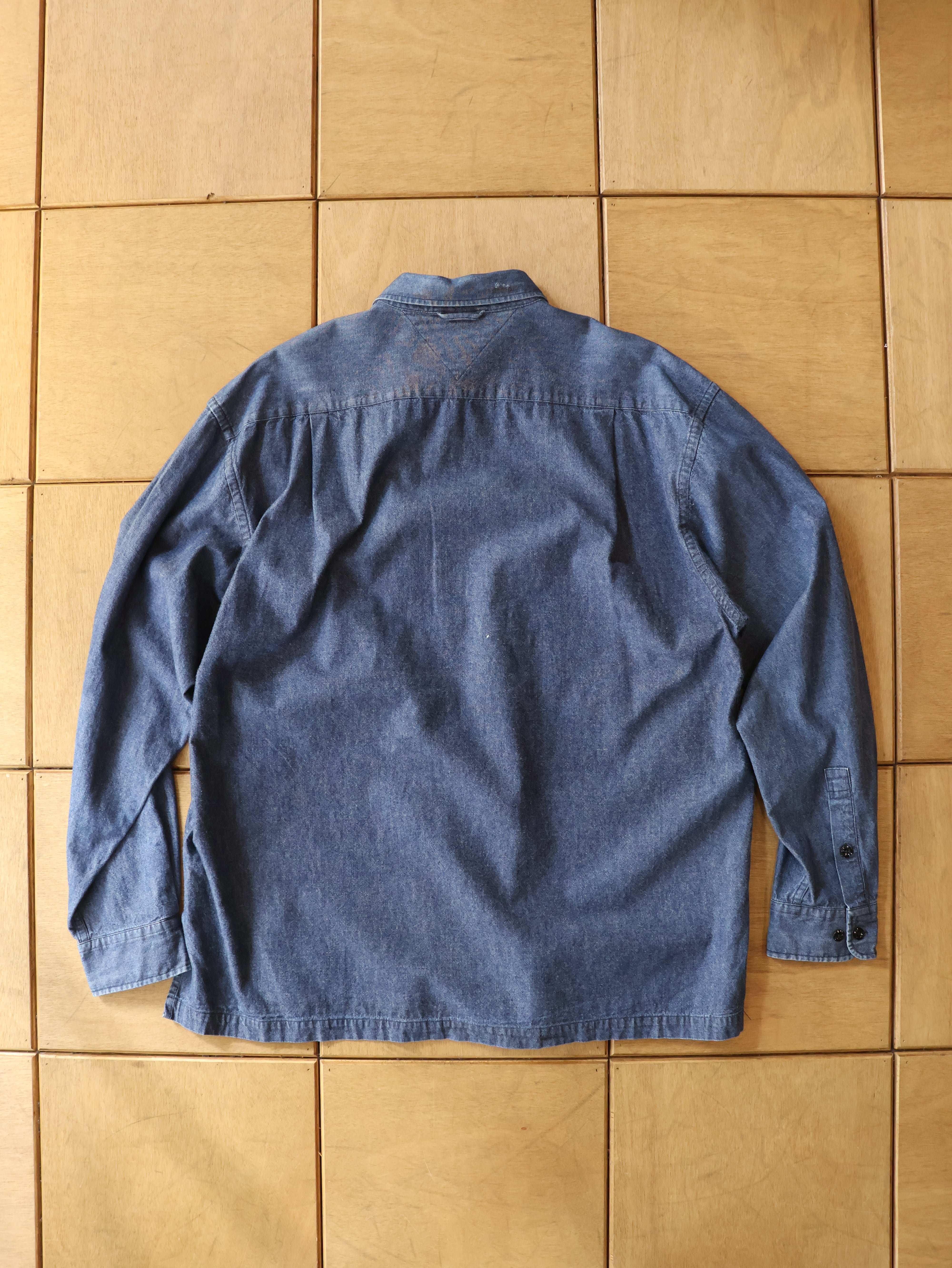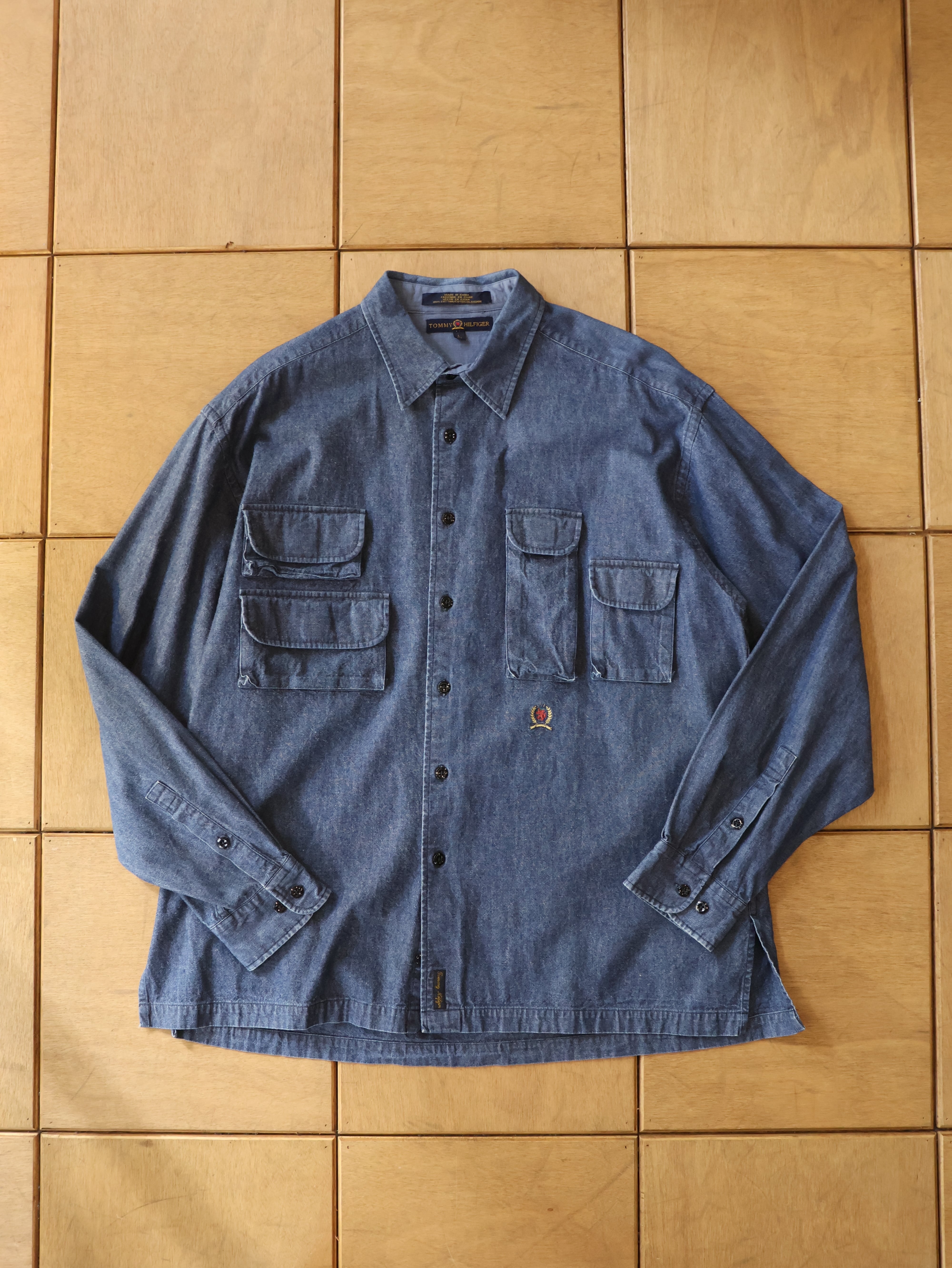 90s TOMMY HILFIGER chambray fishing shirt 表記L インディゴ シャンブレー フィッシングシャツ トミーヒルフィガー【0010】