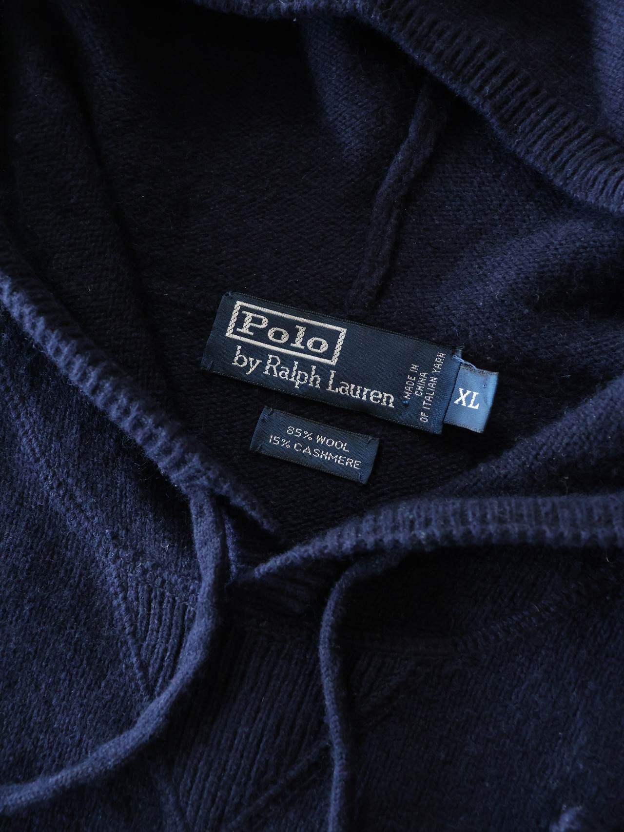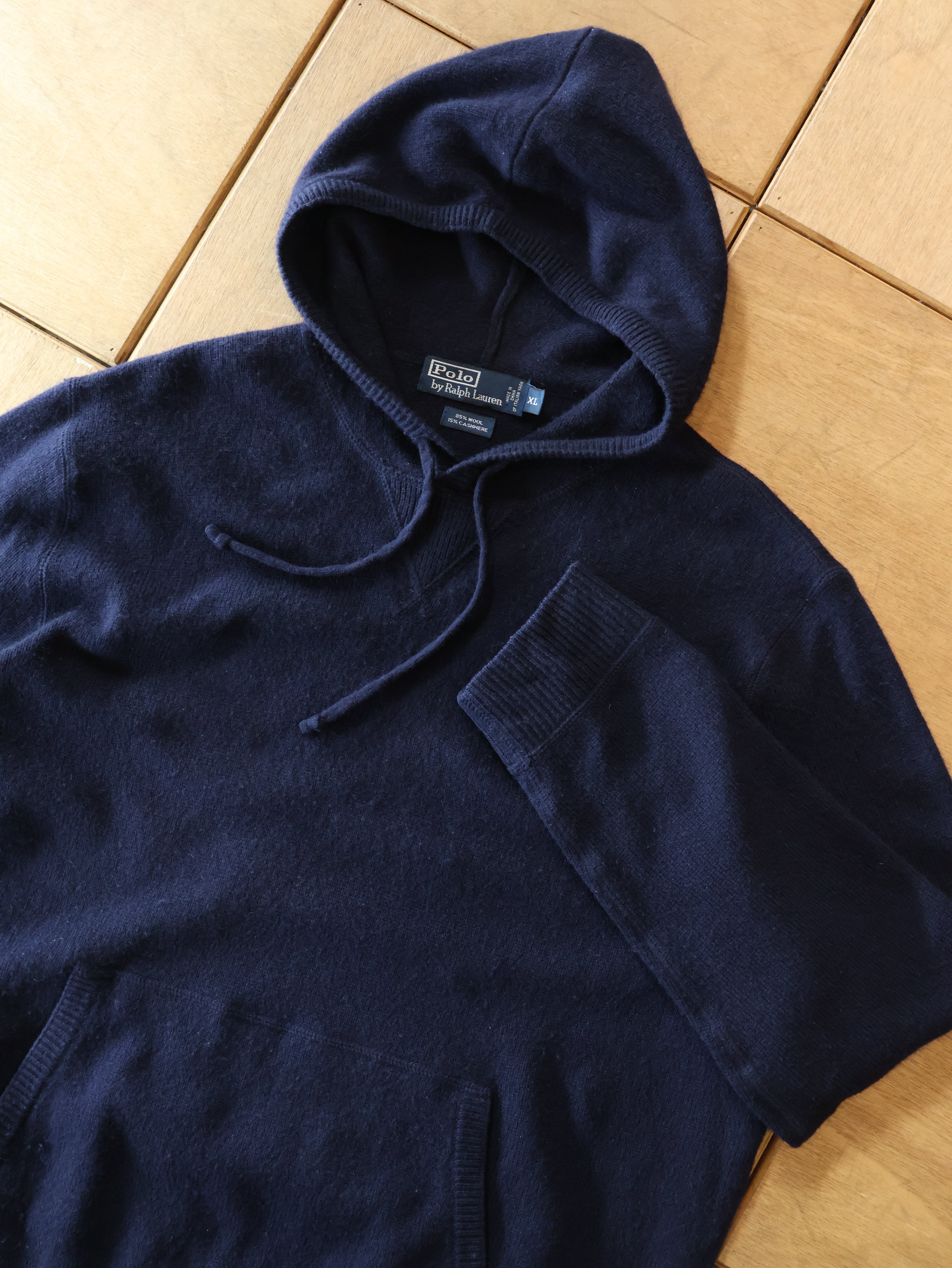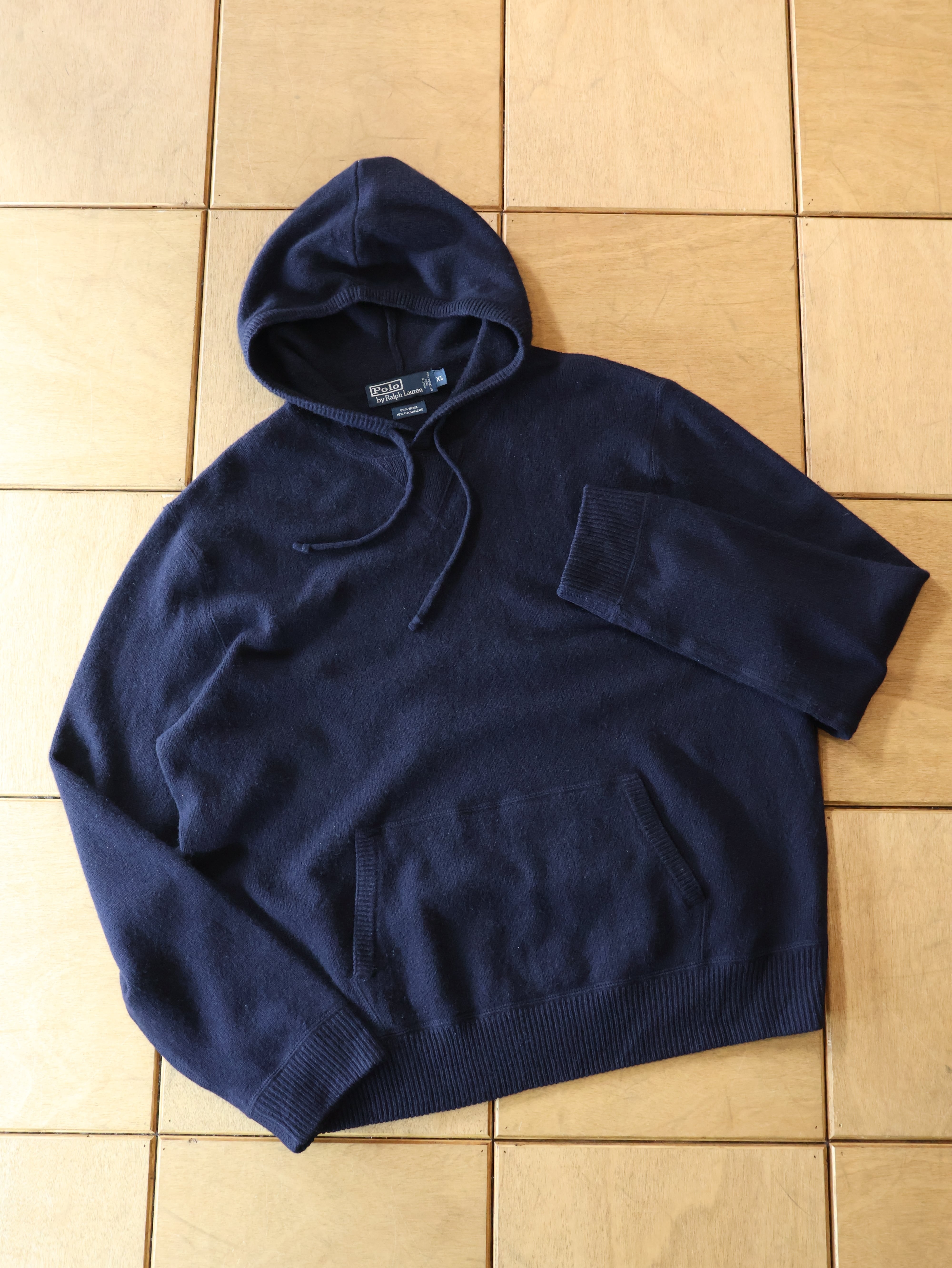 90s Polo by Ralph Lauren cashmere/wool knit hoodie 表記XL ネイビー カシミヤ混 ウールニットフーディ パーカー 前V ポロバイラルフローレン【0087】