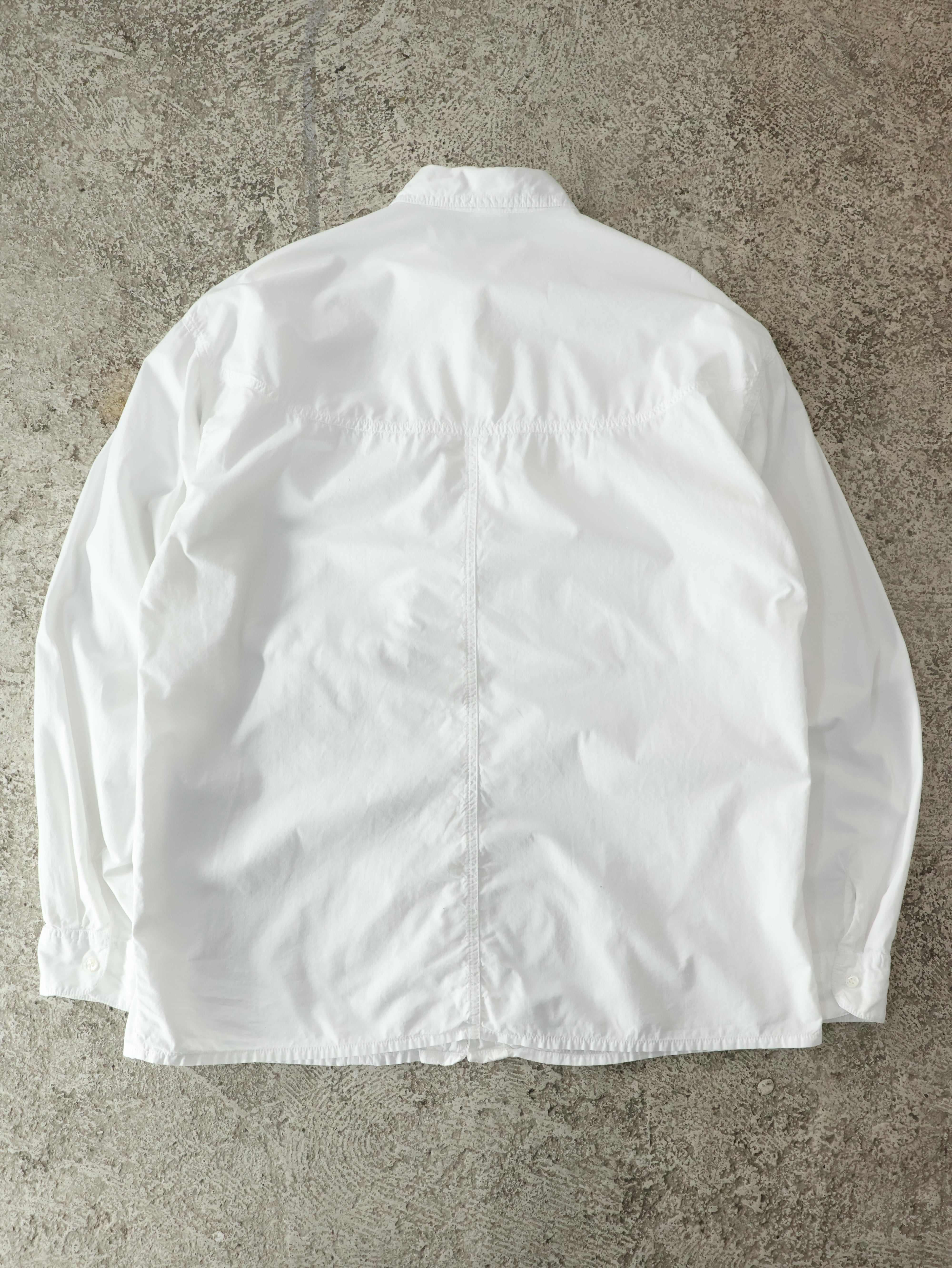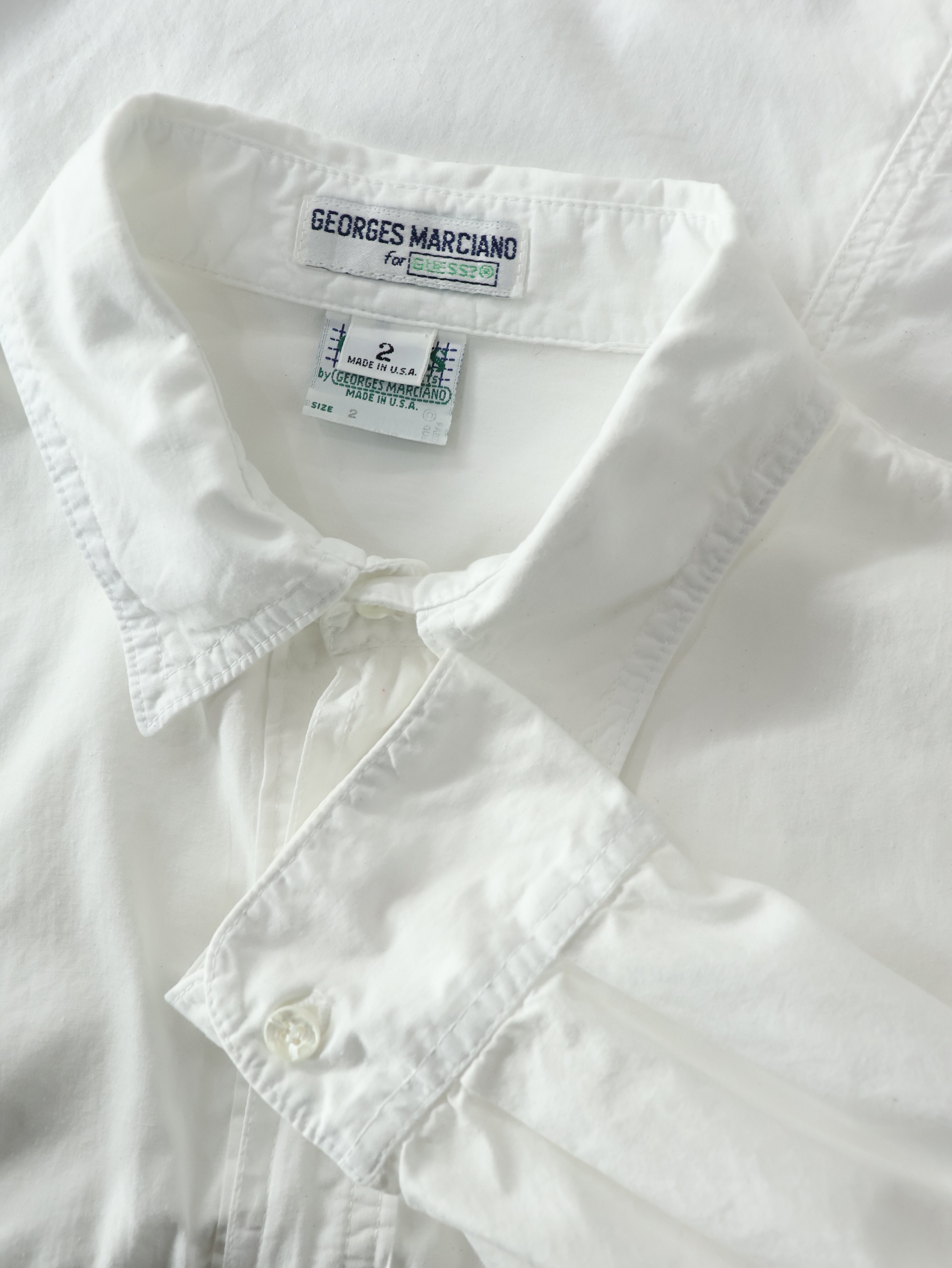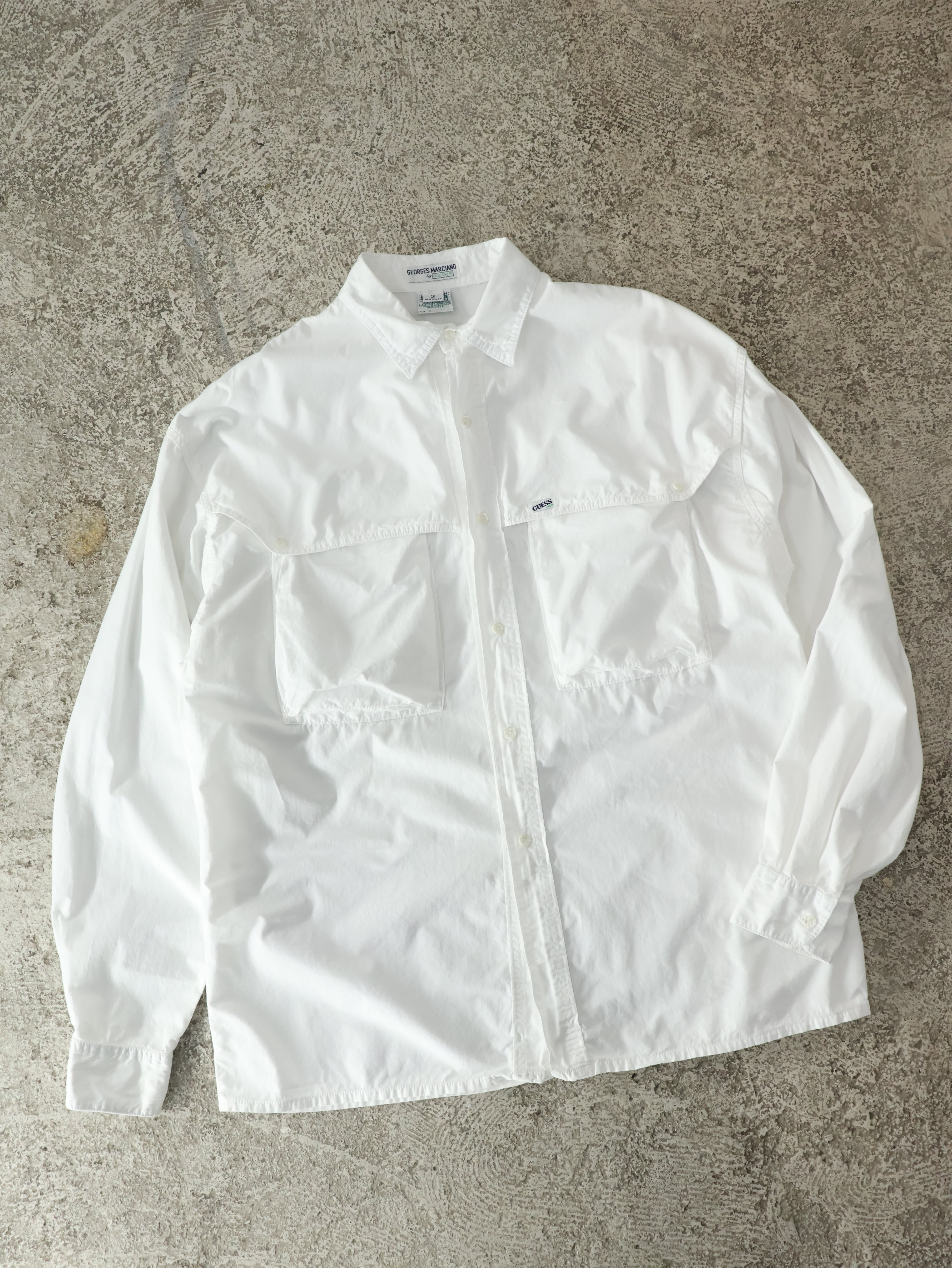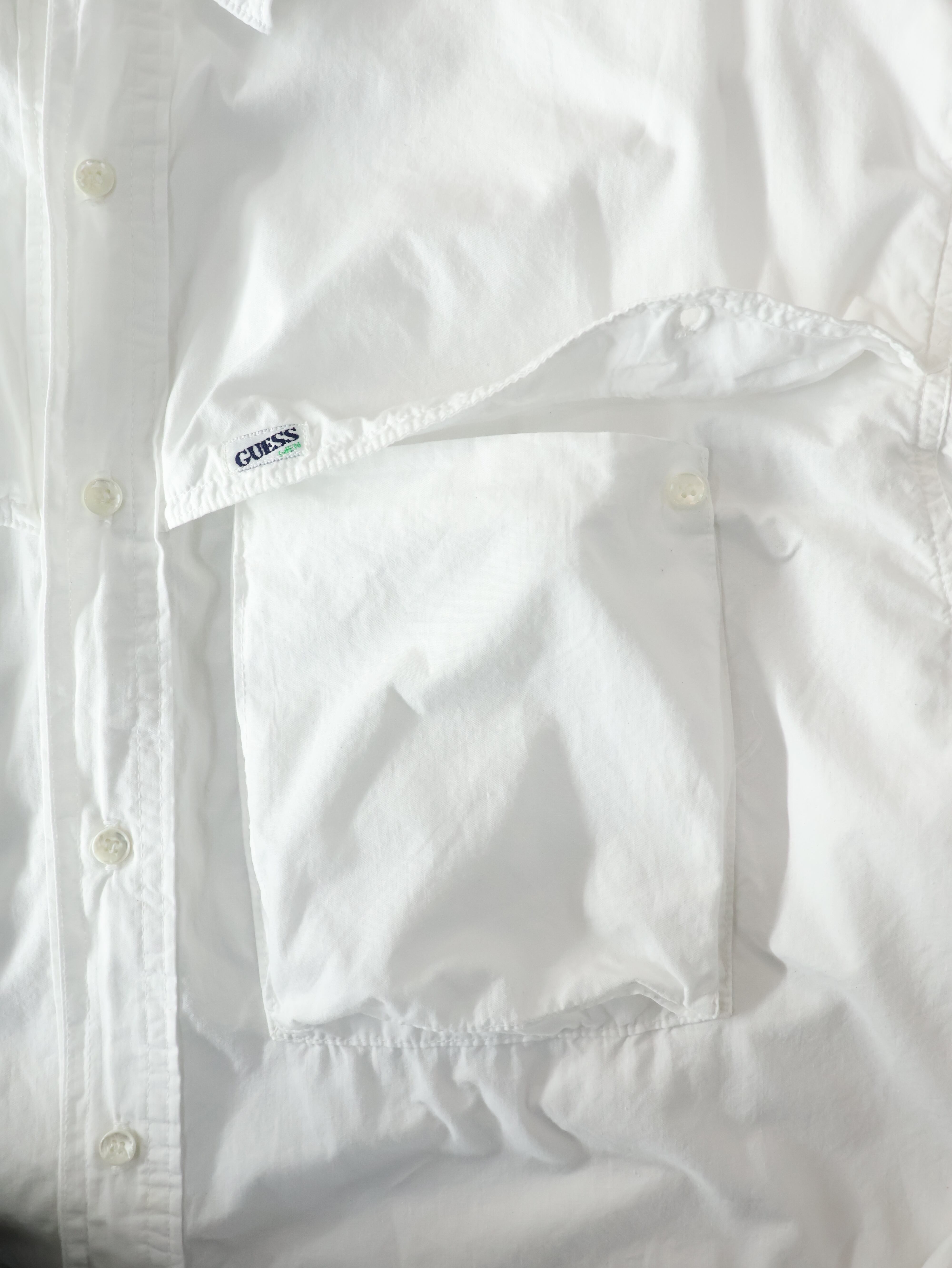 90s GUESS cotton poplin shirt L程 ホワイト コットンポプリン 長袖シャツ 変形 マチ付きポケット USA製 ゲス【0097】