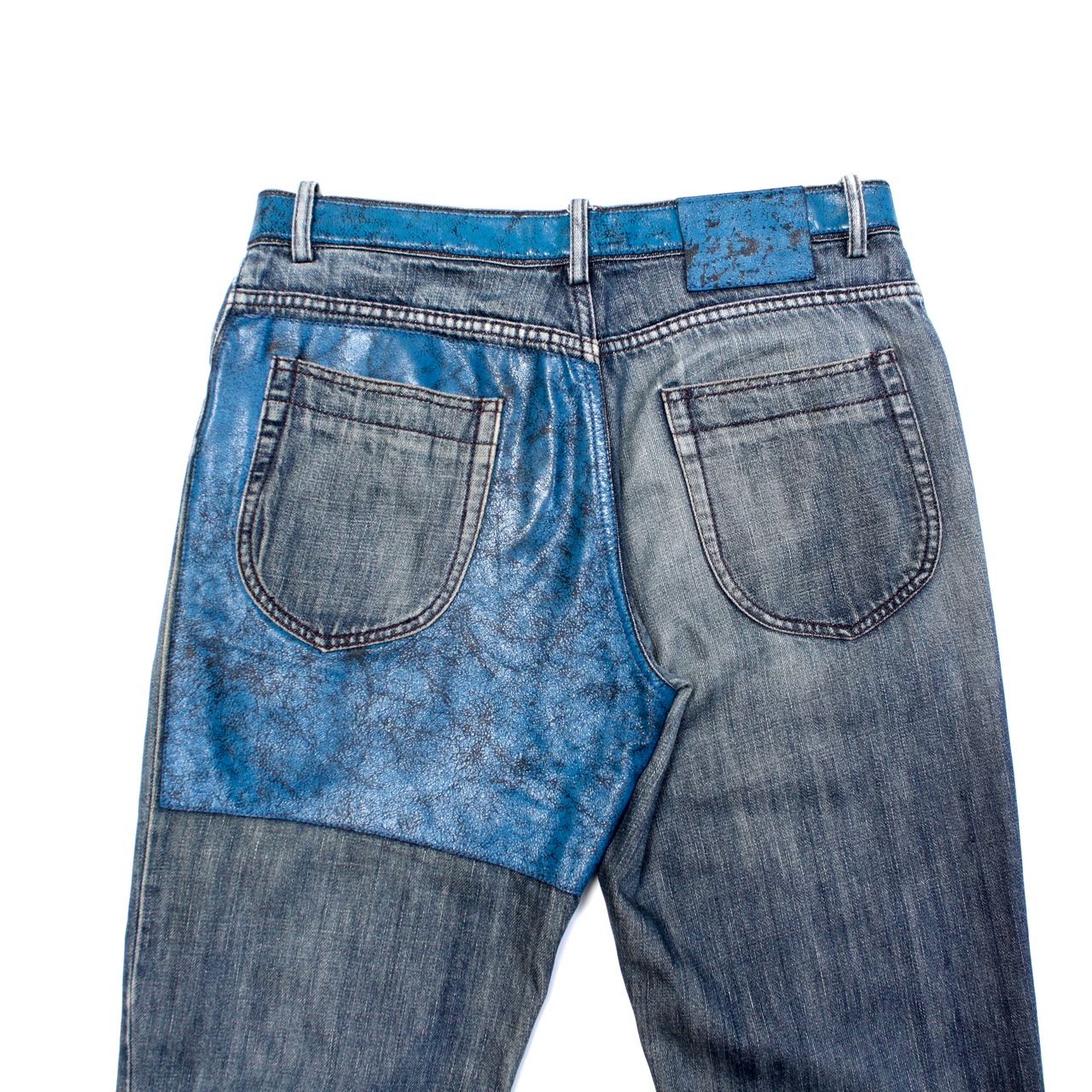 0345. 2006SS maison martin margiela painted leather switching denim ブルー ペンキデニム レザー切替 00s 00年代 古着 メゾンマルタンマルジェラ ここのえタグ