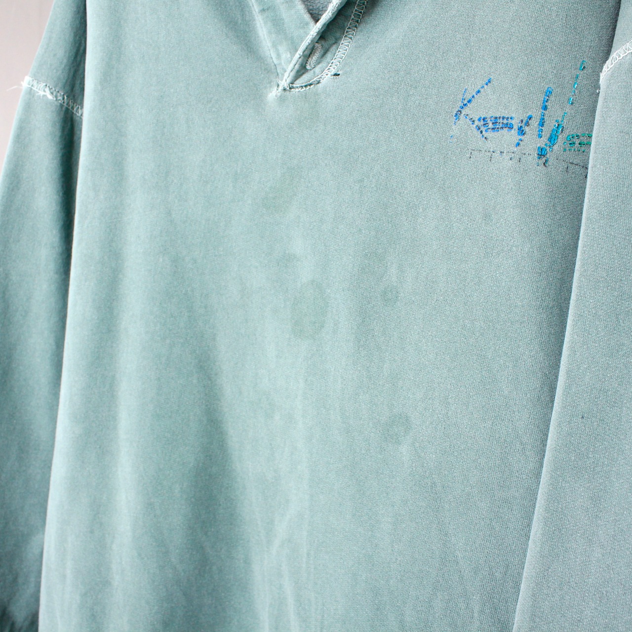 全体的にボロボロです。前のオーナーが相当好きで着ていたのを伺えます。原形は裏起毛のスウェットだと思いますが、ロンTに近いオンスになっています。写真にてご確認ください。