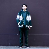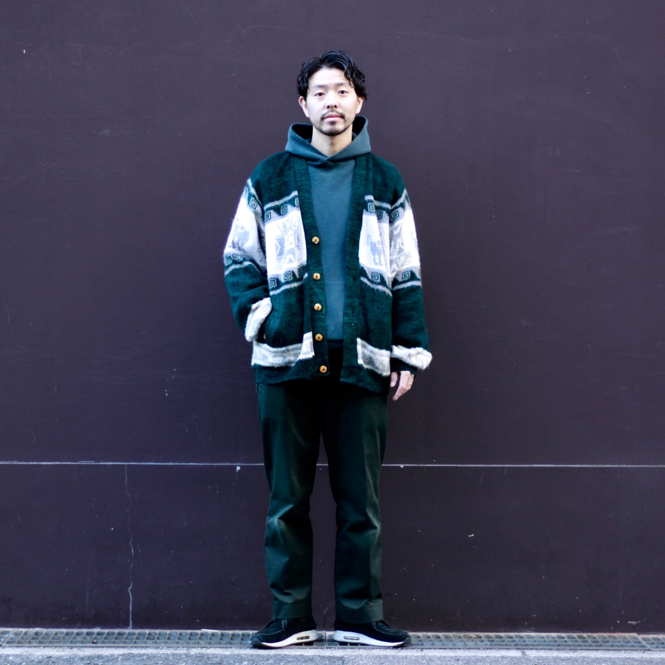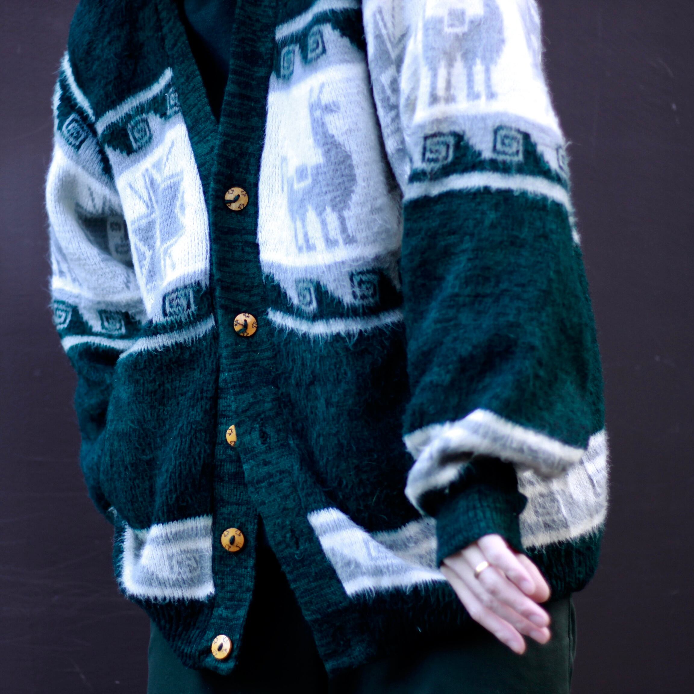 0891. vintage shaggy knit cardigan made in Ecuador グリーン × ホワイト ミックスウール ハンドニット カーディガン エクアドル製 古着