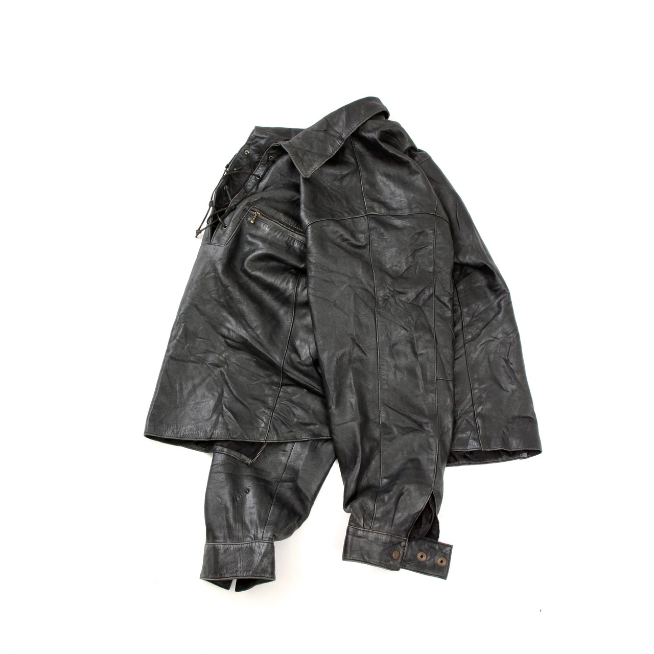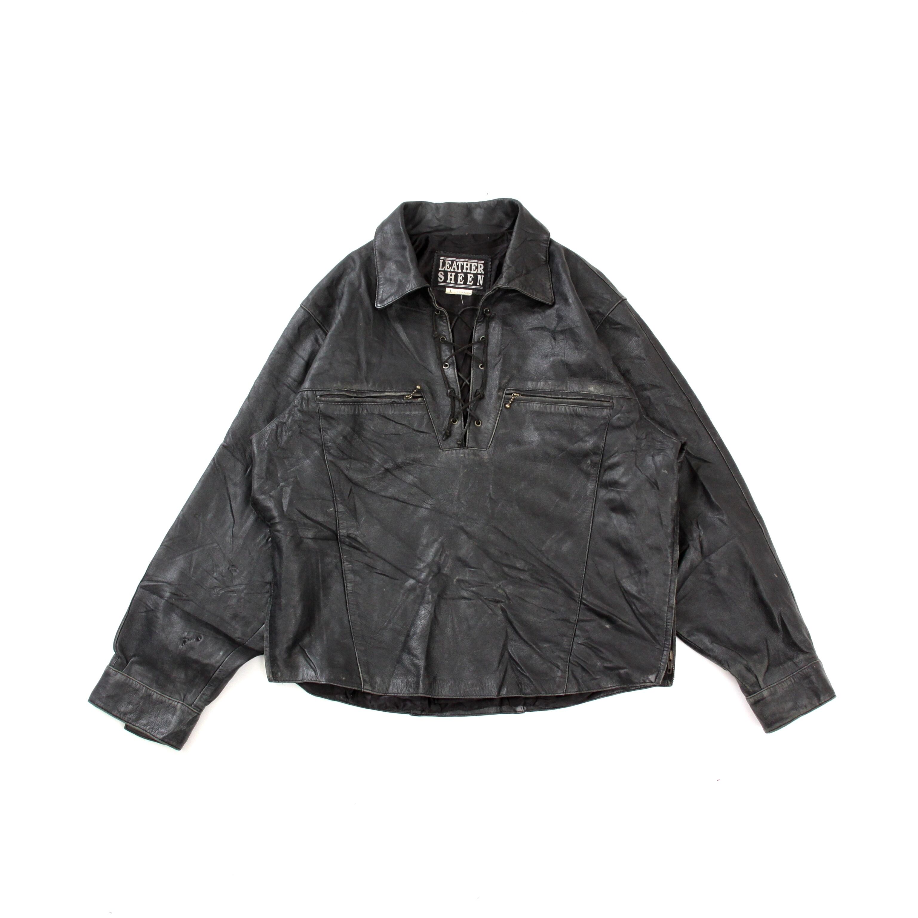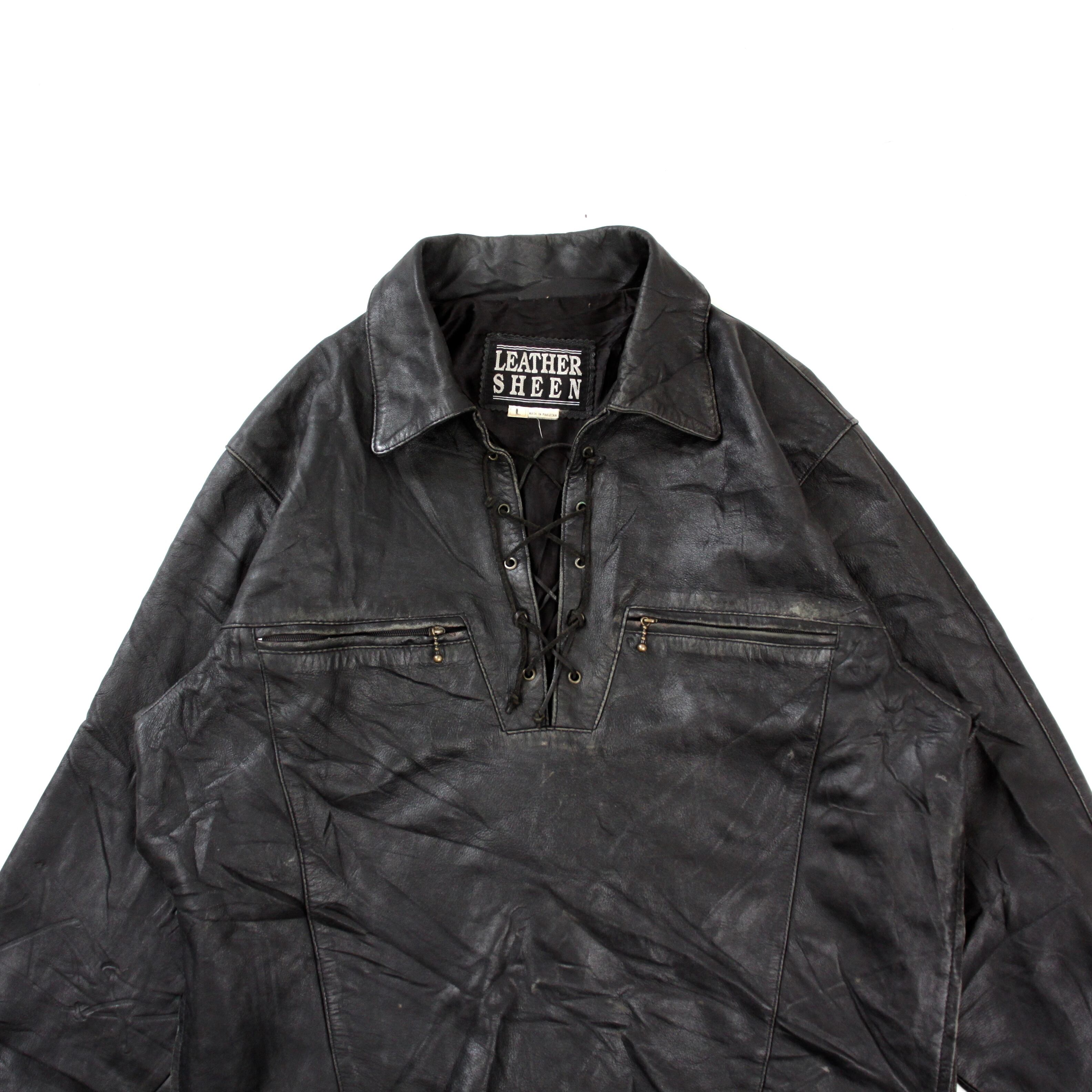 0052. smooth leather lace up shirt ブラック レザー レースアップ プルオーバーシャツ ユーロ古着 euro vintage