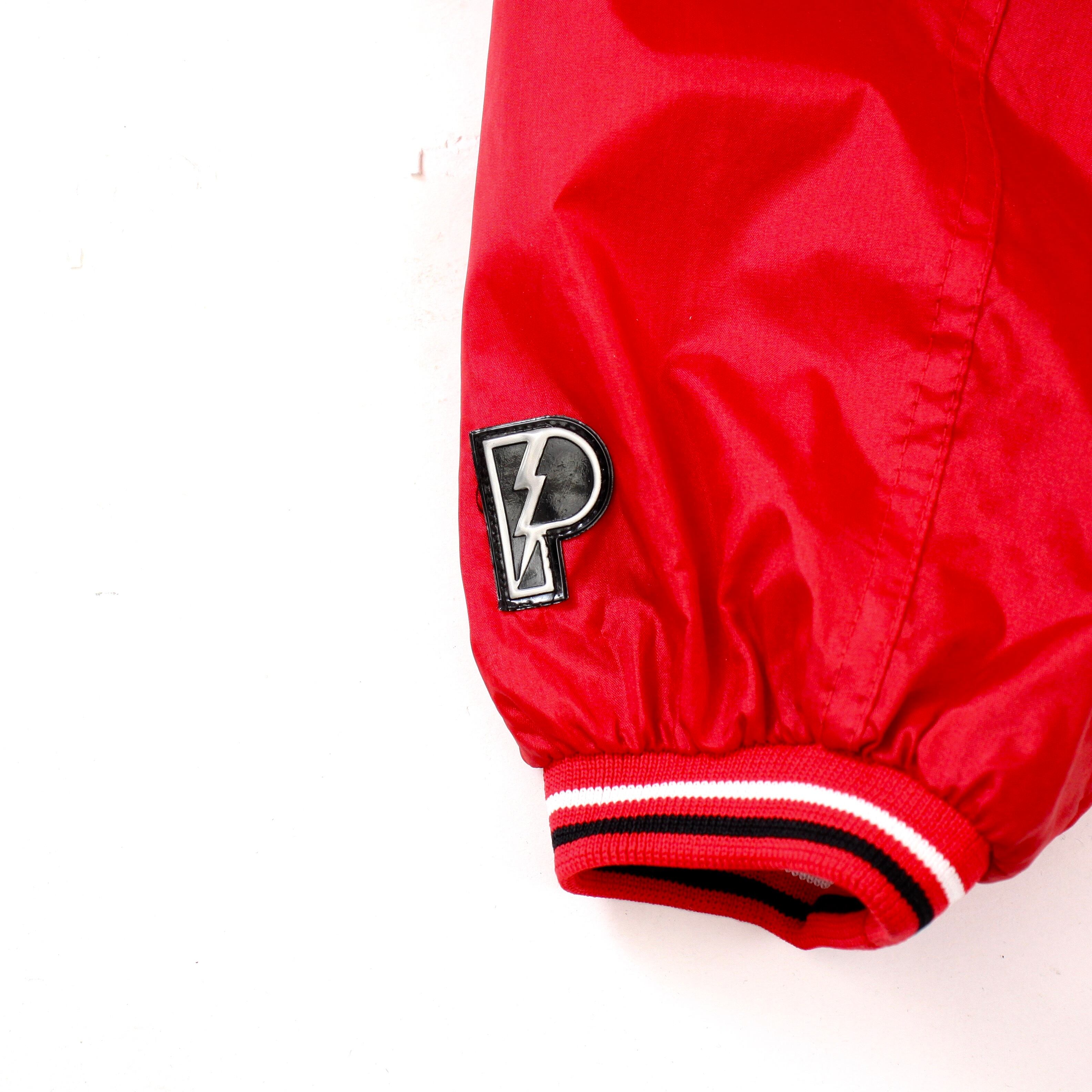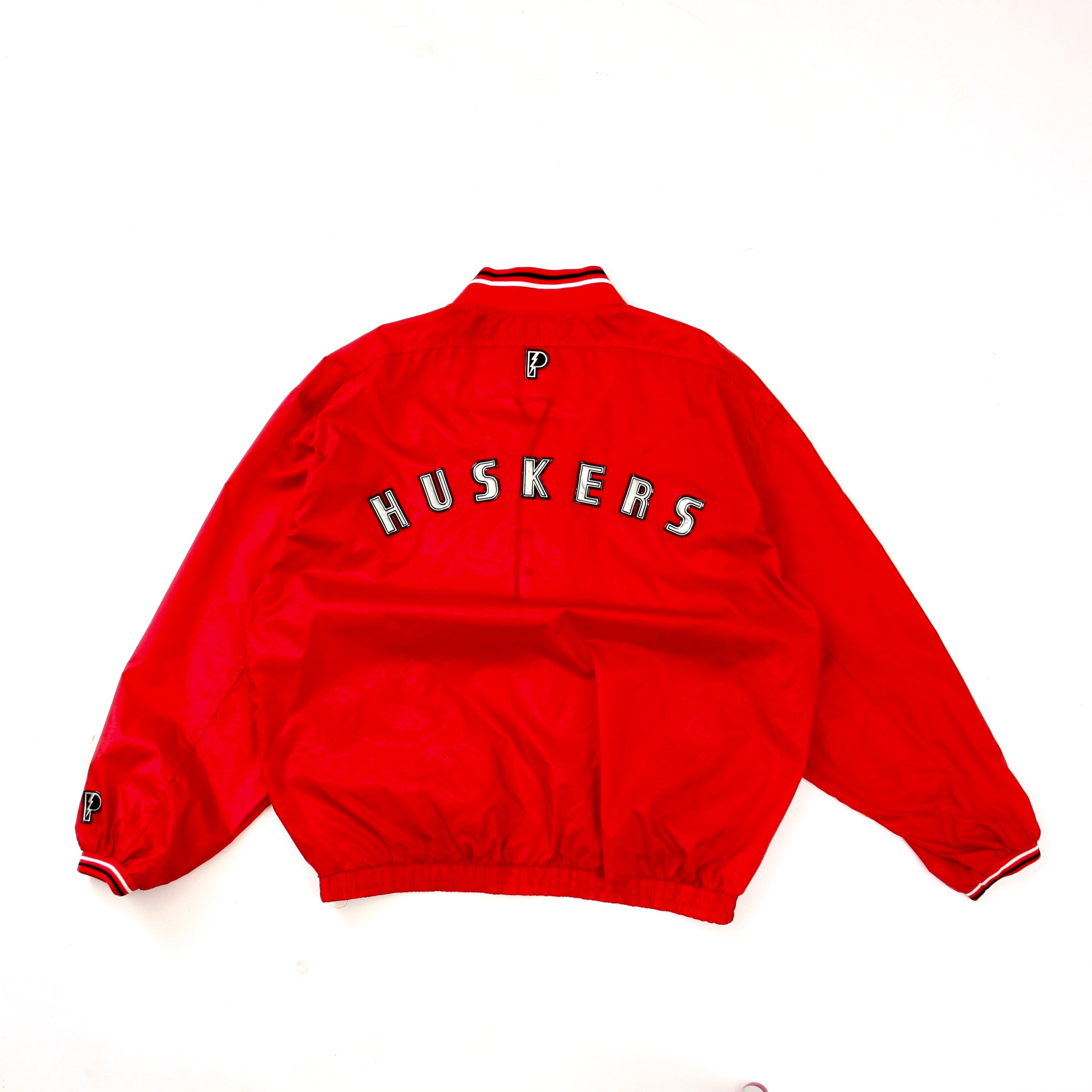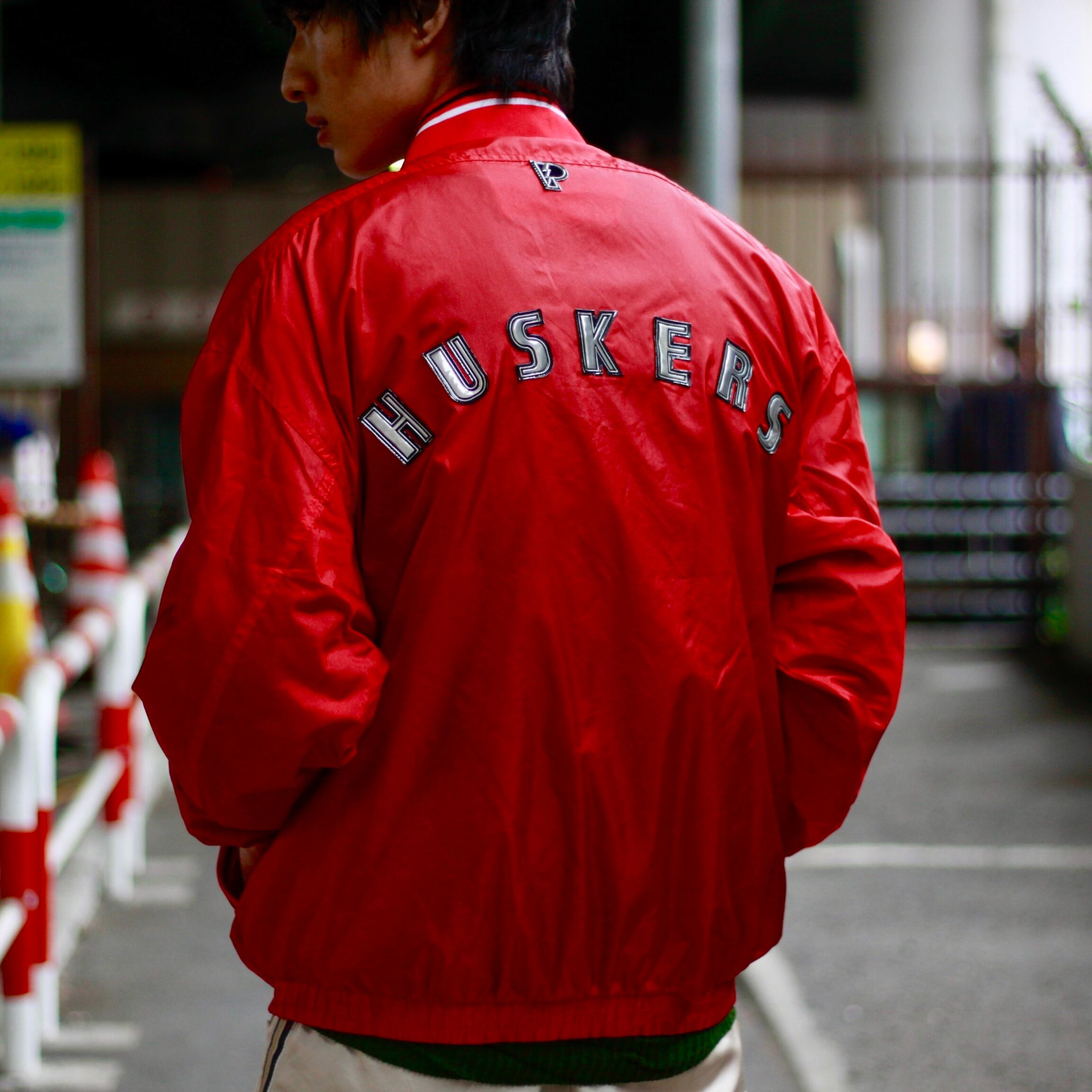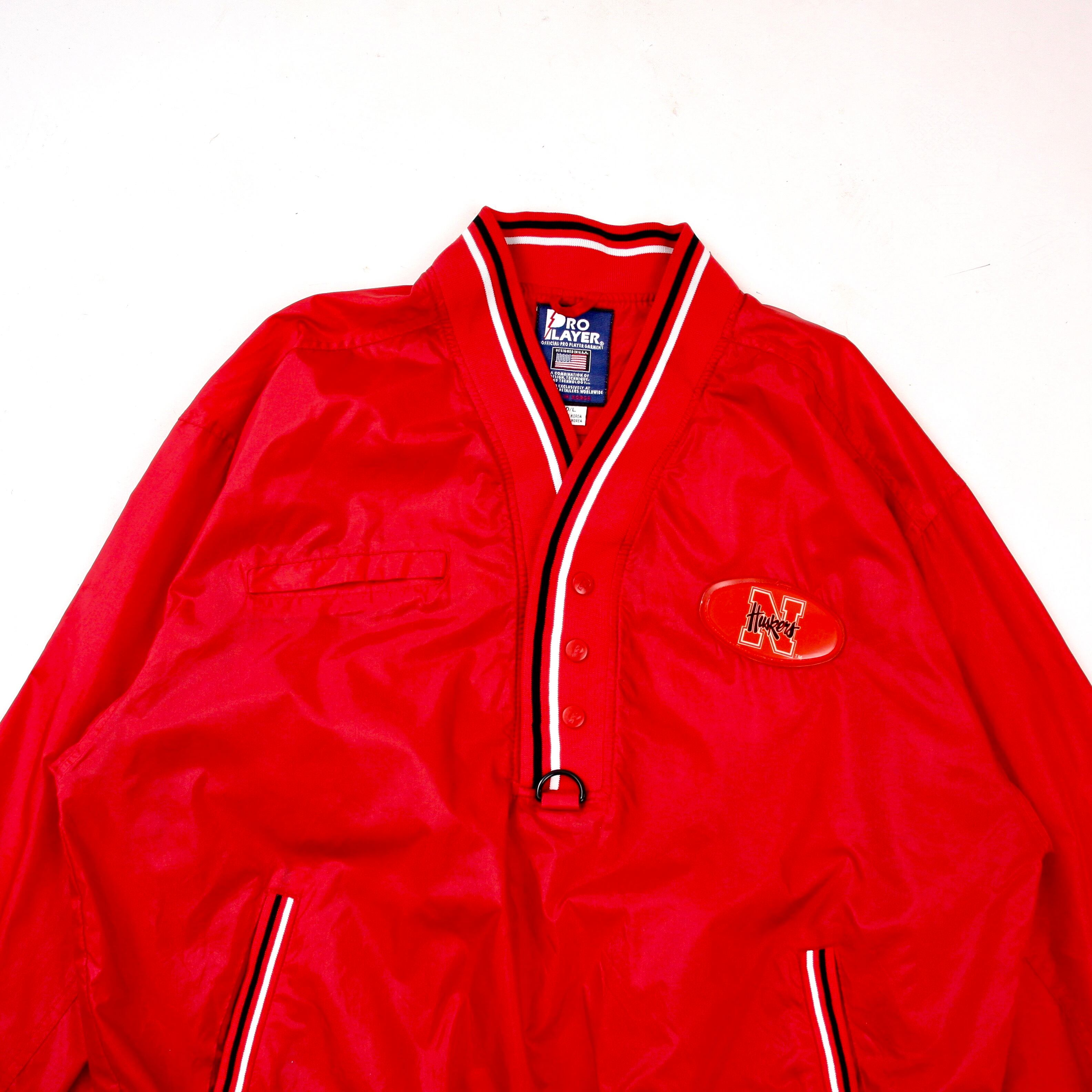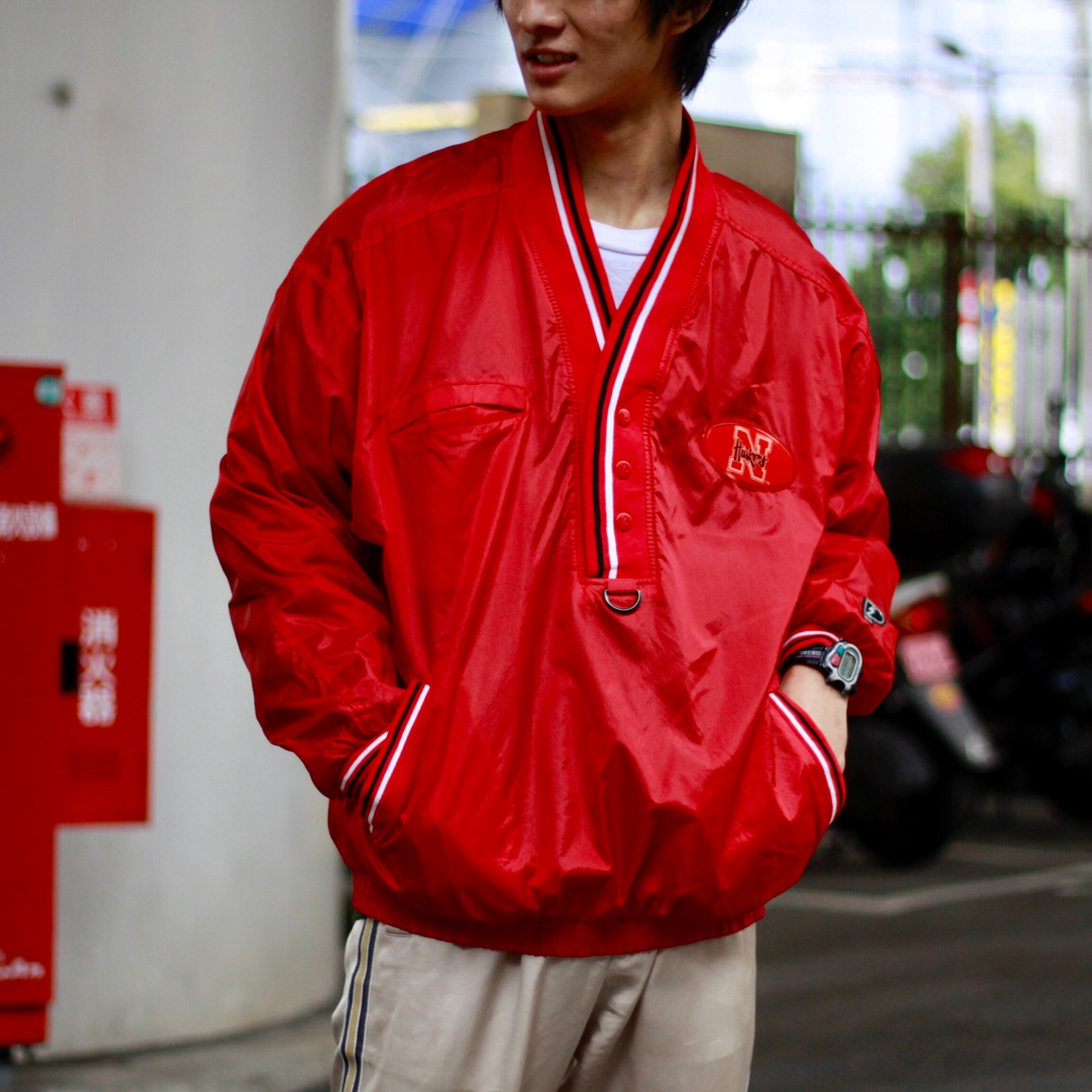 0057. 1990's college pullover jumper レッド ネブラスカ大学 コーンハスカーズ カレッジ ナイロン プルオーバージャケット 90s 90年代 vintage 古着
