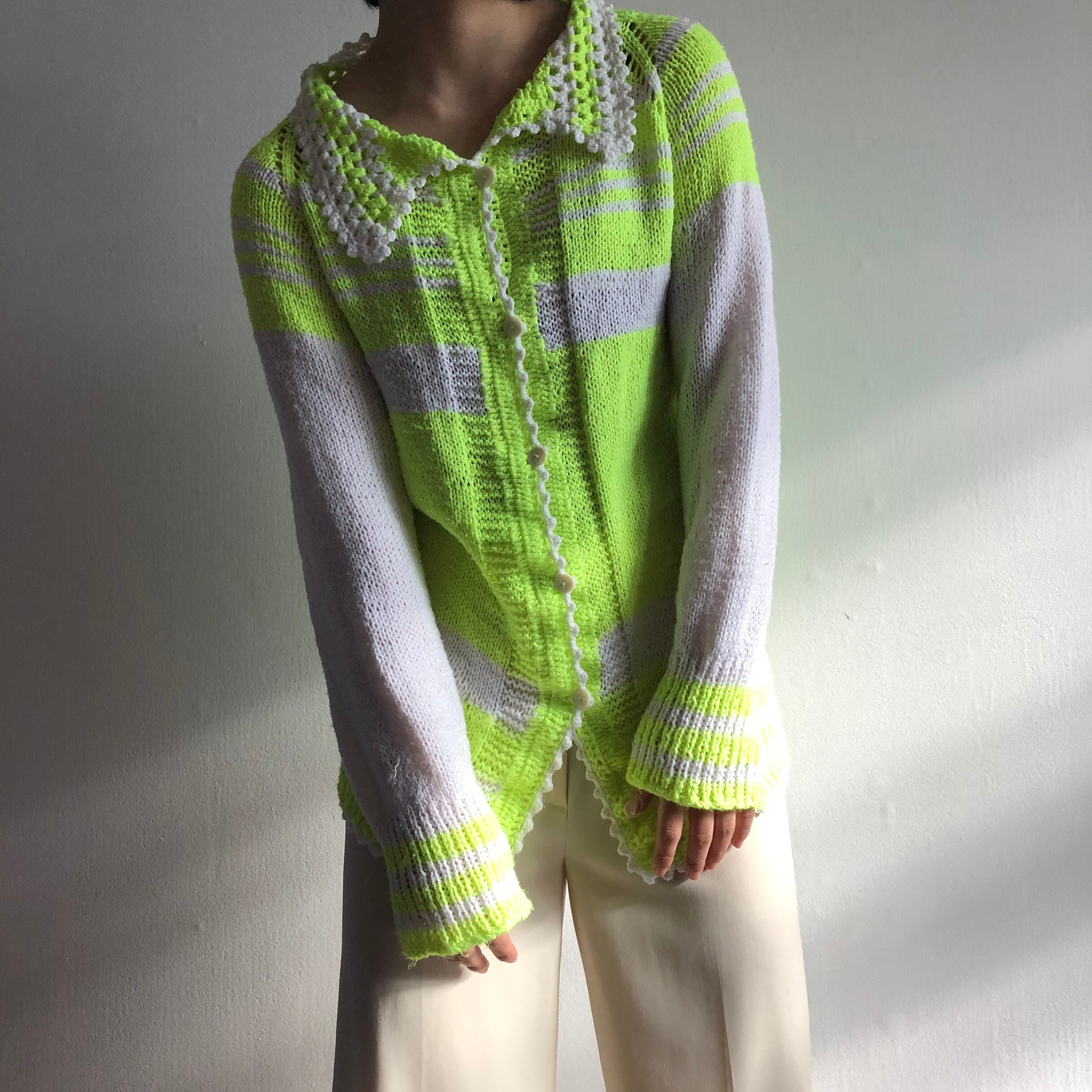 0104. neon yellow handkni?t cardigan ネオンカラー イエロー ハンドニット カーディガン レディース古着