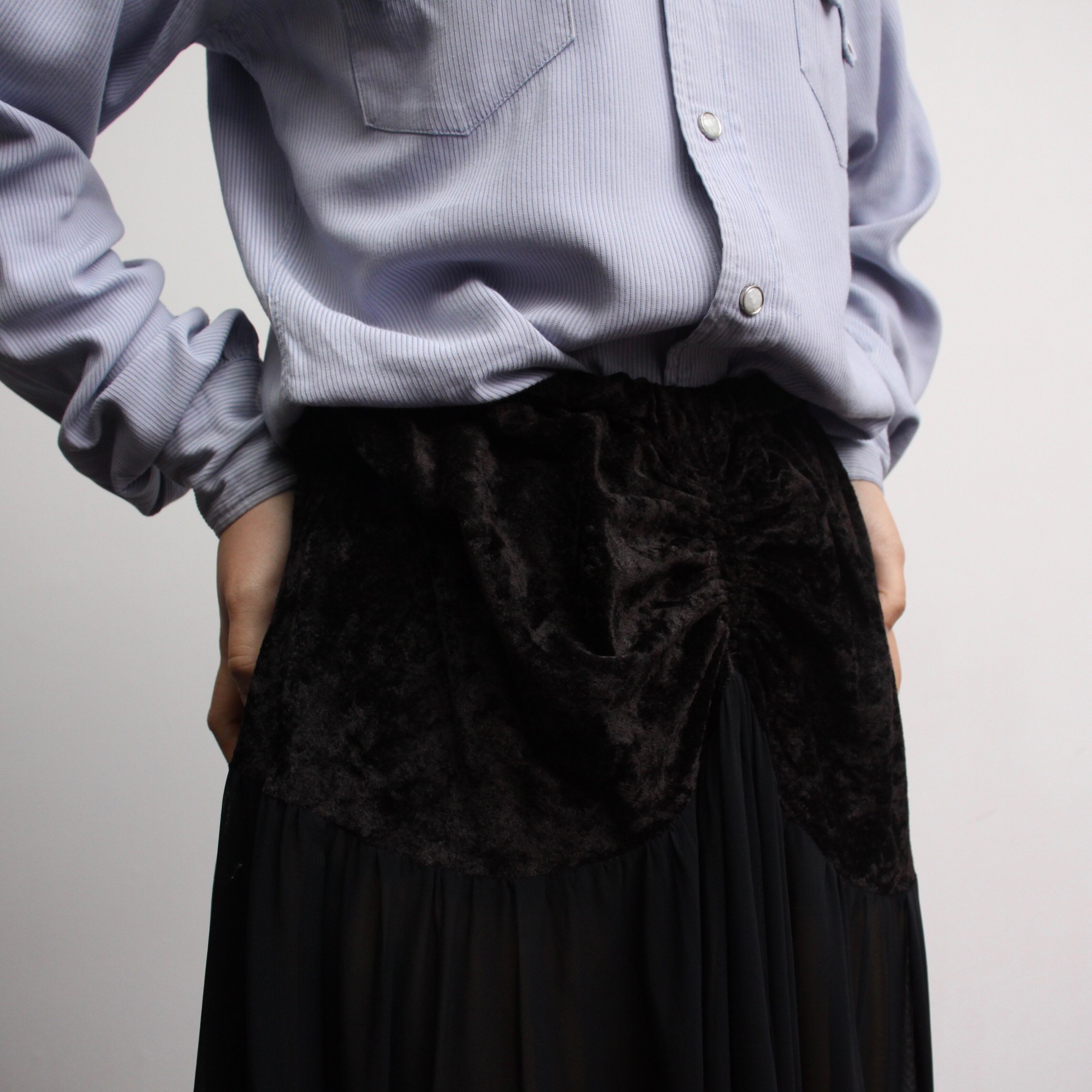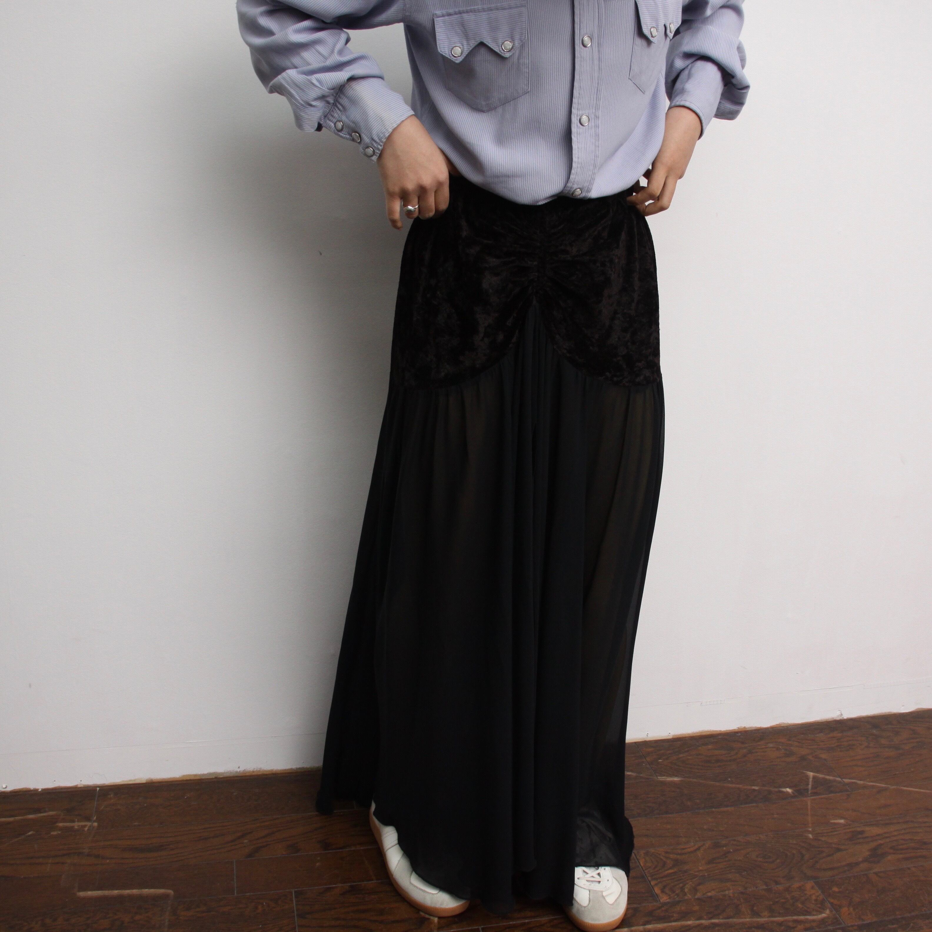 0166. velours & sheer switching skirt ブラック ベロア シースルー ロングスカート レディース古着