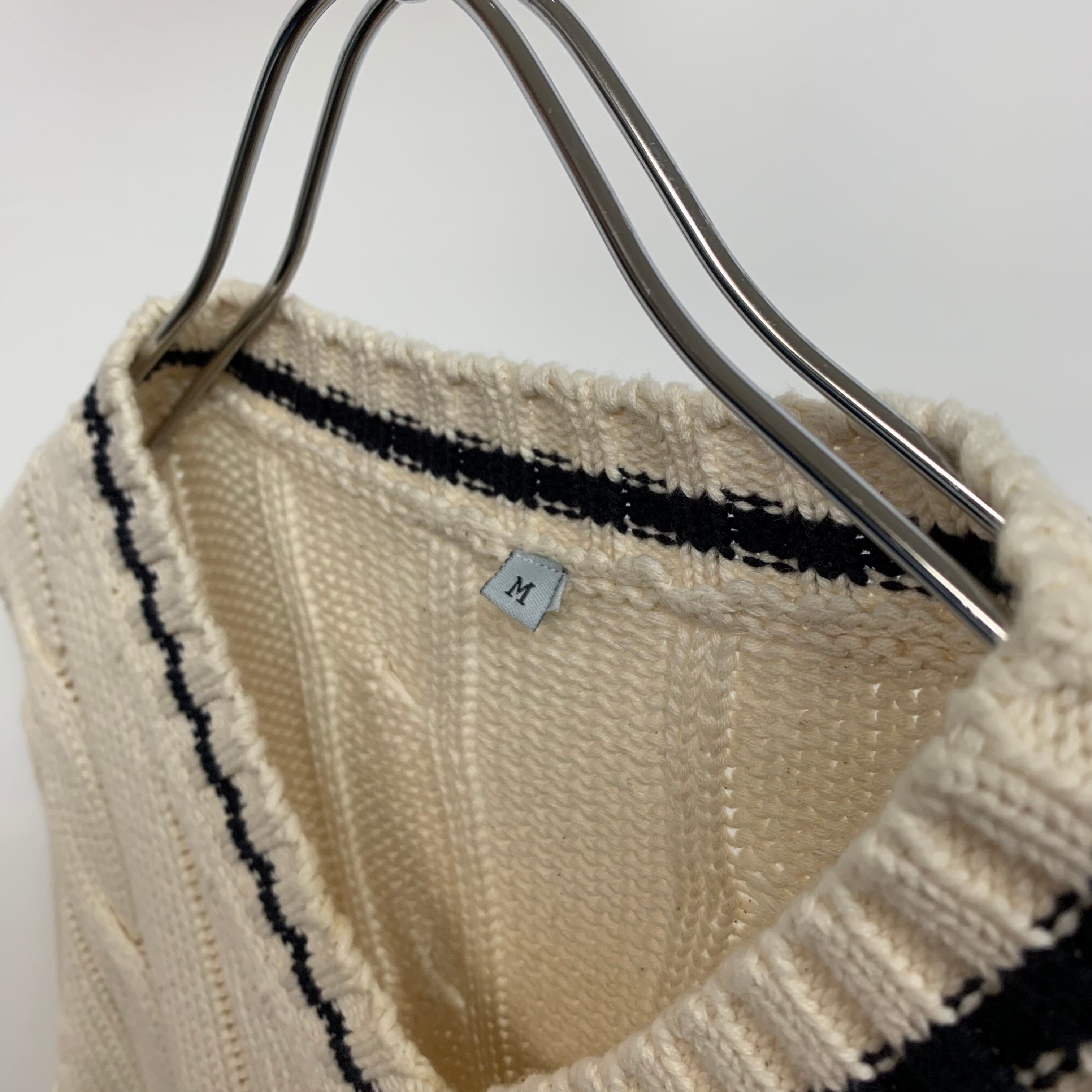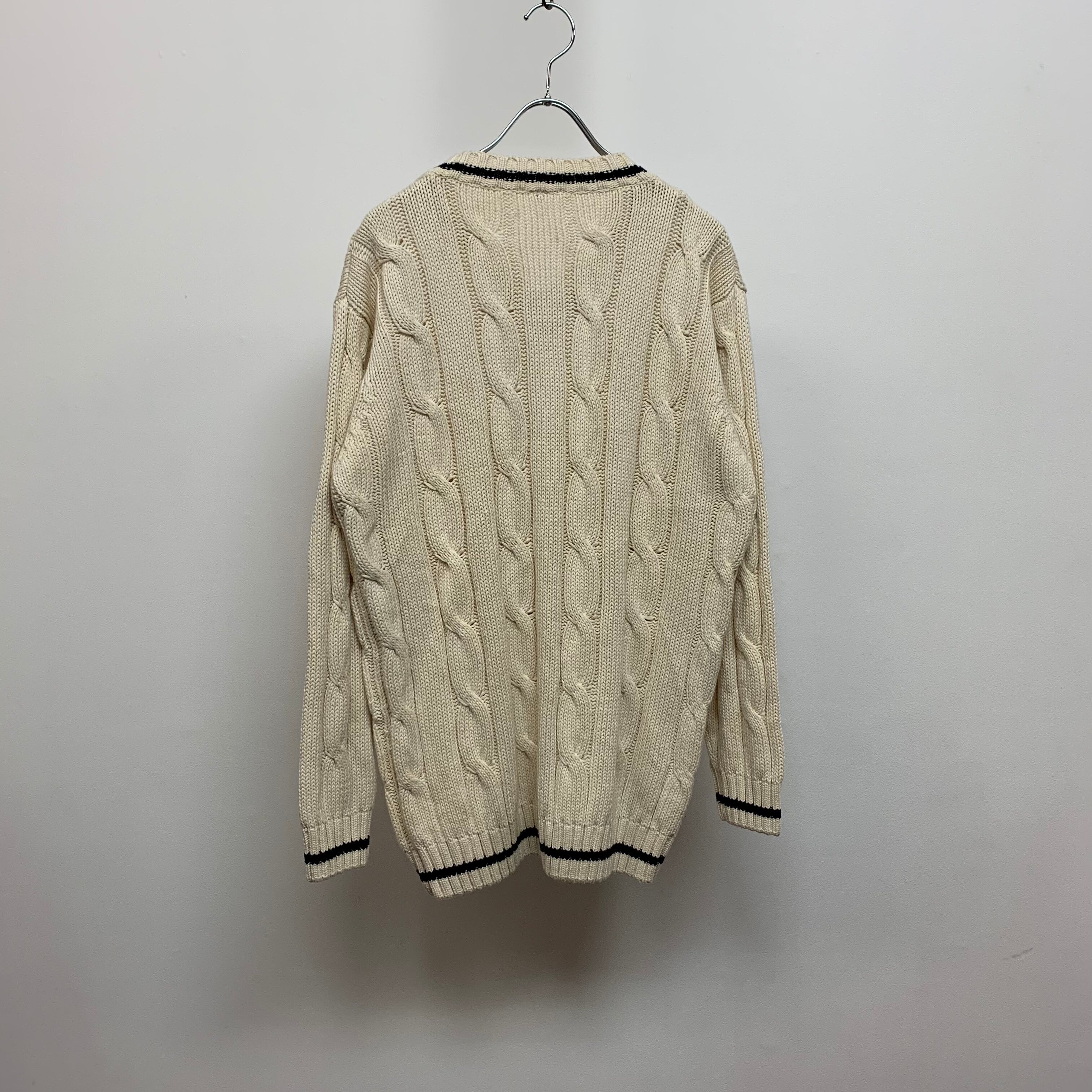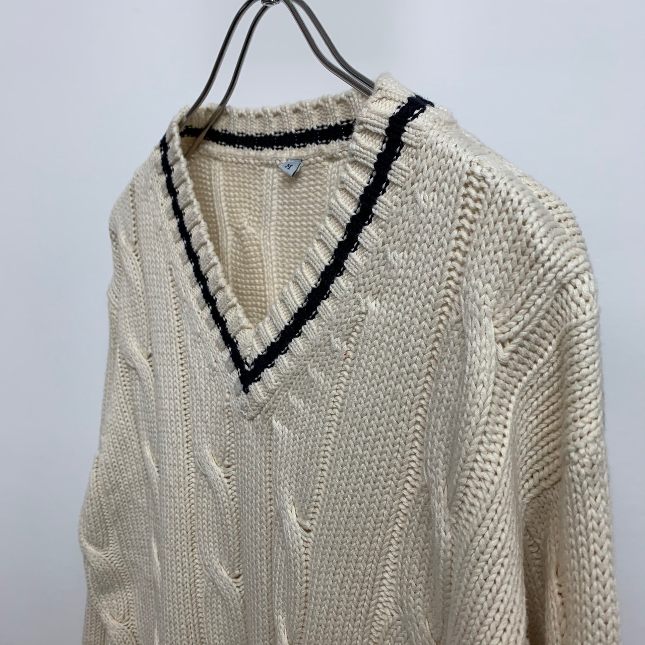 0147. solid color tilden sweater オフホワイト Vネック チルデンセーター ケーブル コットンニット 古着