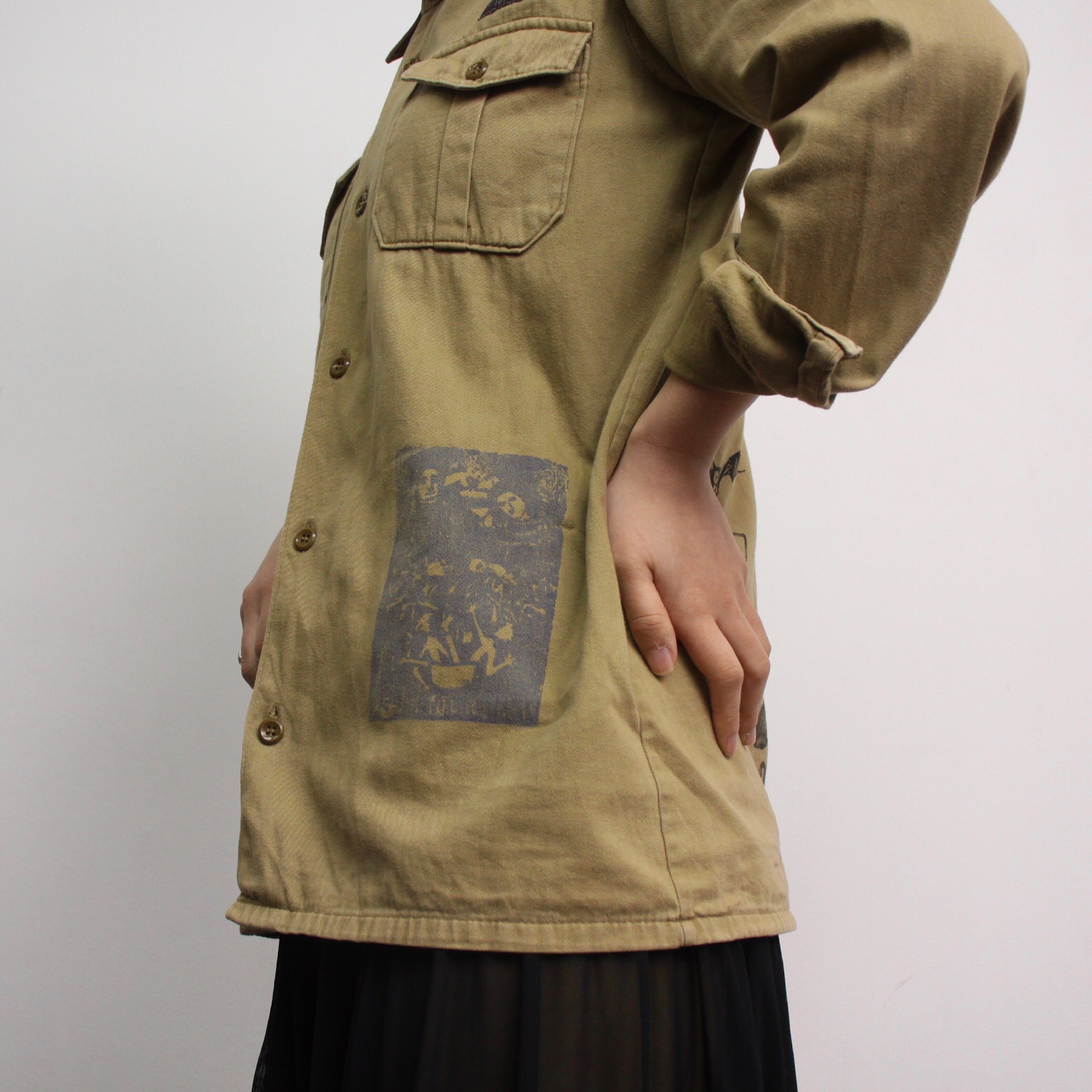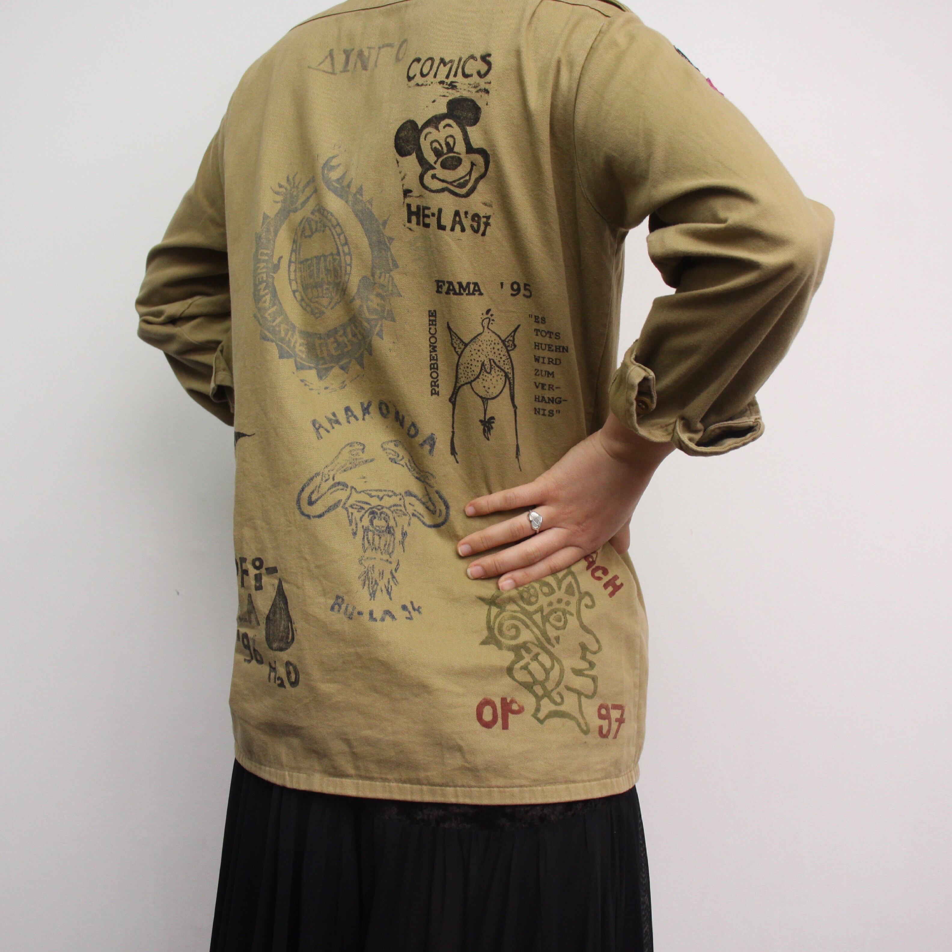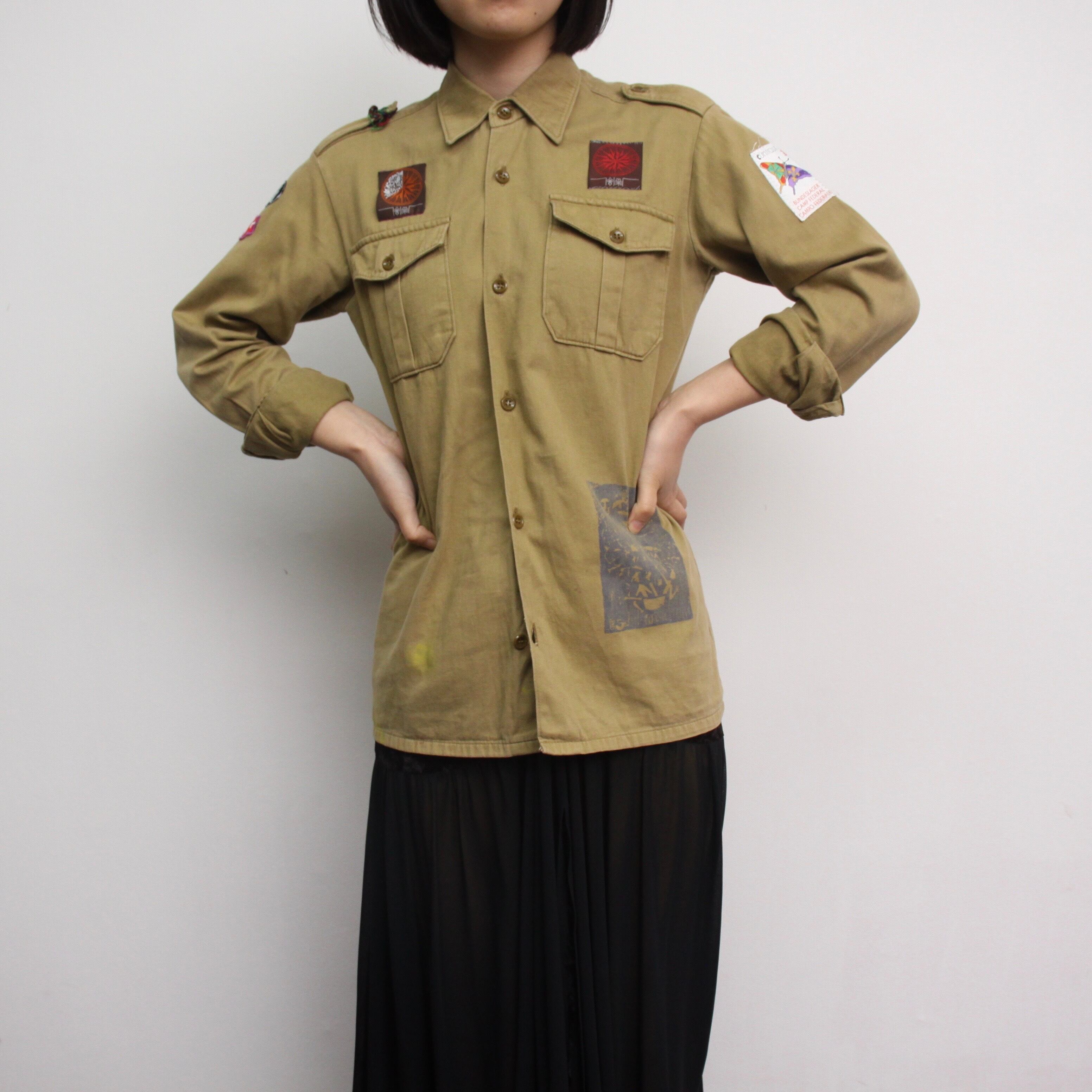 0167. memorial scout shirt カーキ ボーイスカウト ミリタリー シャツ 落書き ハンドペイント euro vintage ユーロ古着