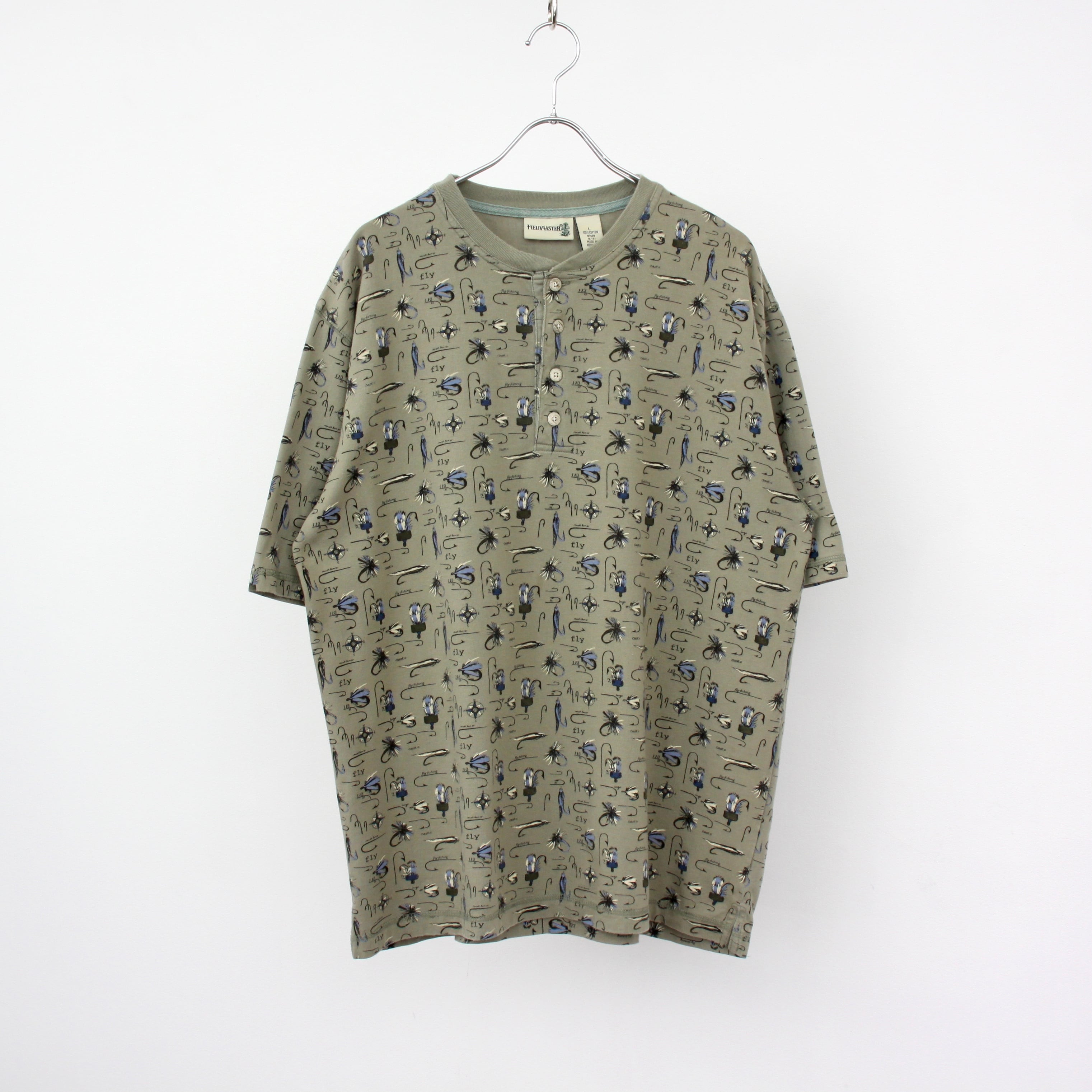 0260. fly fishing pattern tee オリーブ 総柄 フライフィッシング Tシャツ ヘンリーネック field master 古着