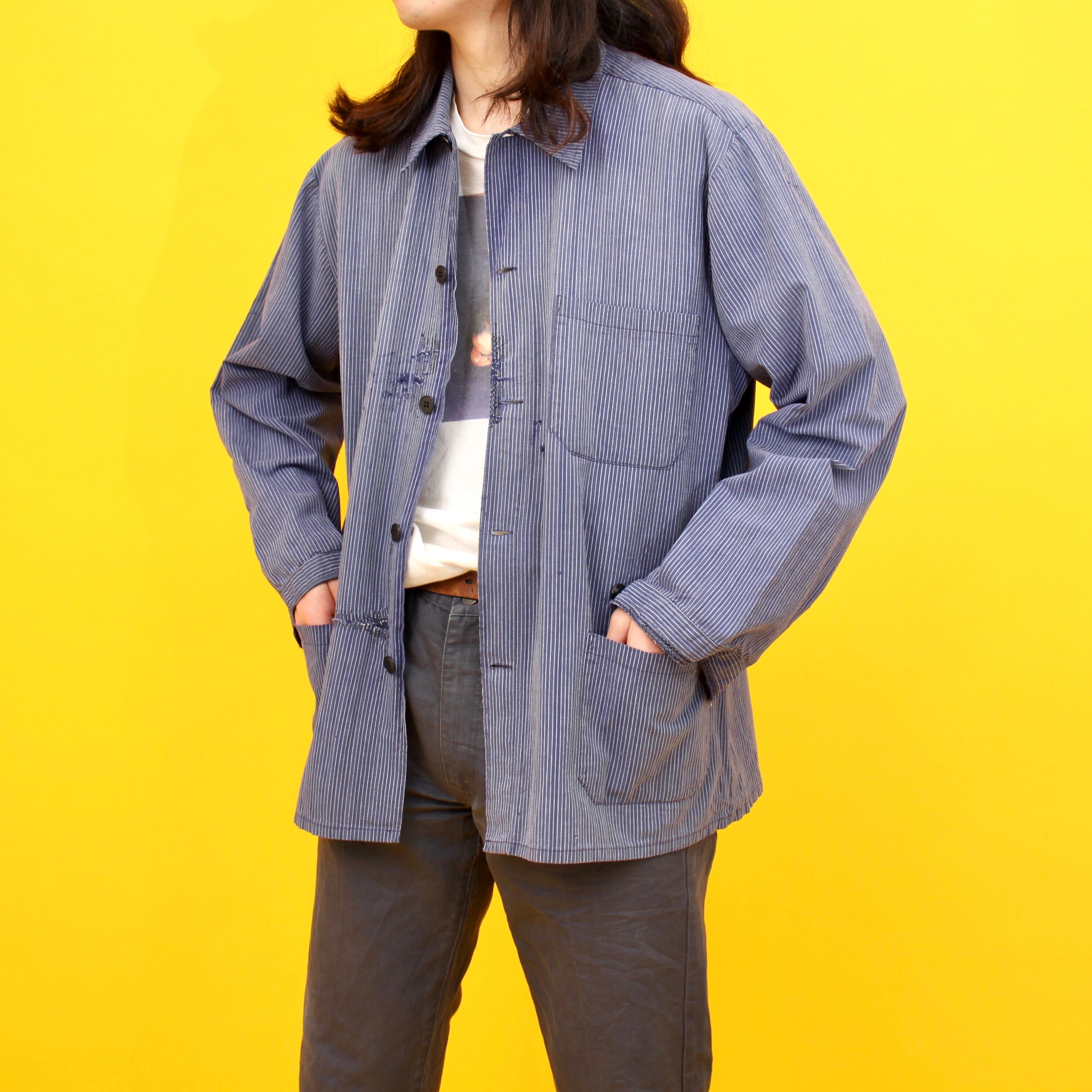 0341. euro work slashed and repaired インクブルー カバーオール ワークジャケット ヒッコリーストライプ リペア ユーロワーク ジャーマンワーク 襤褸 vintage 古着