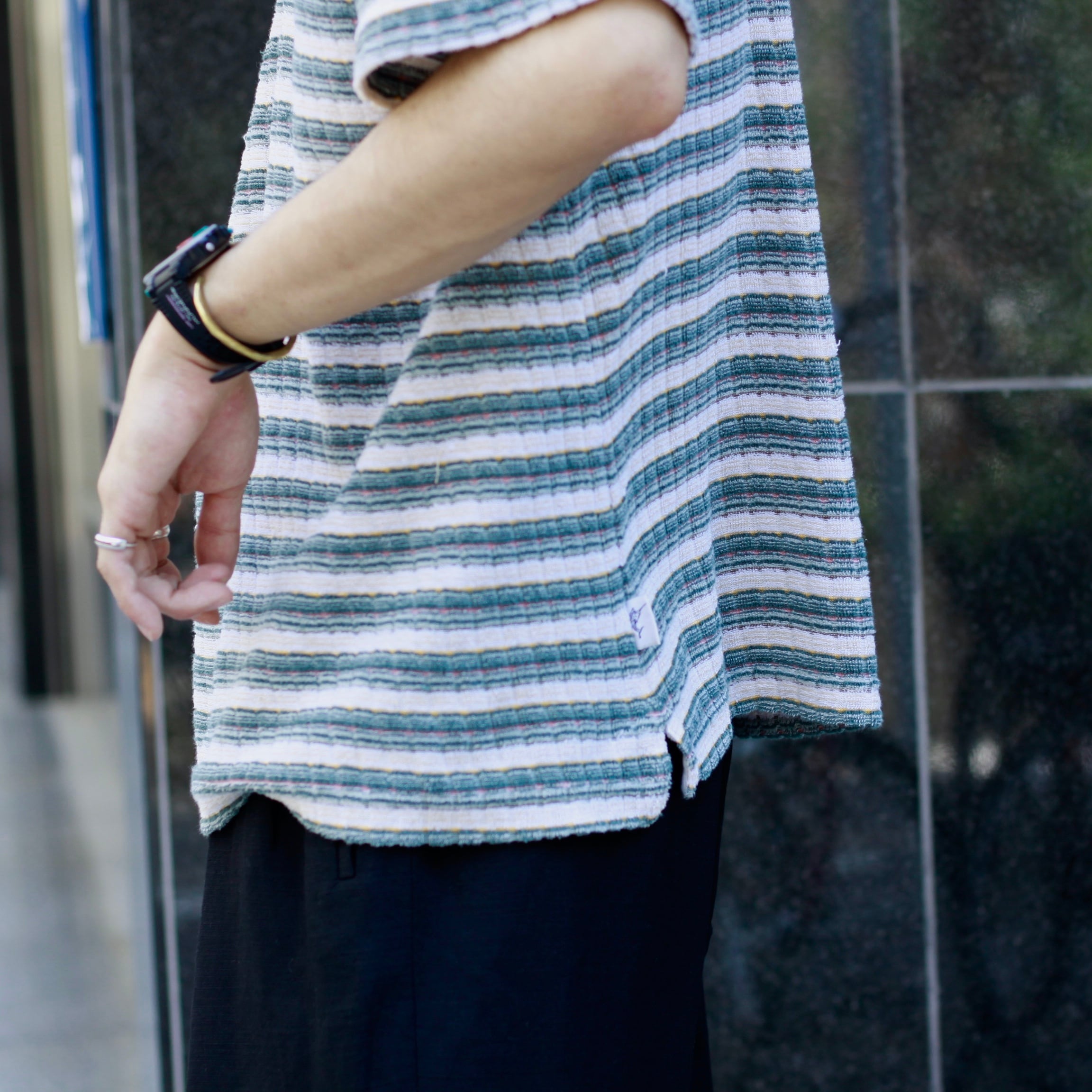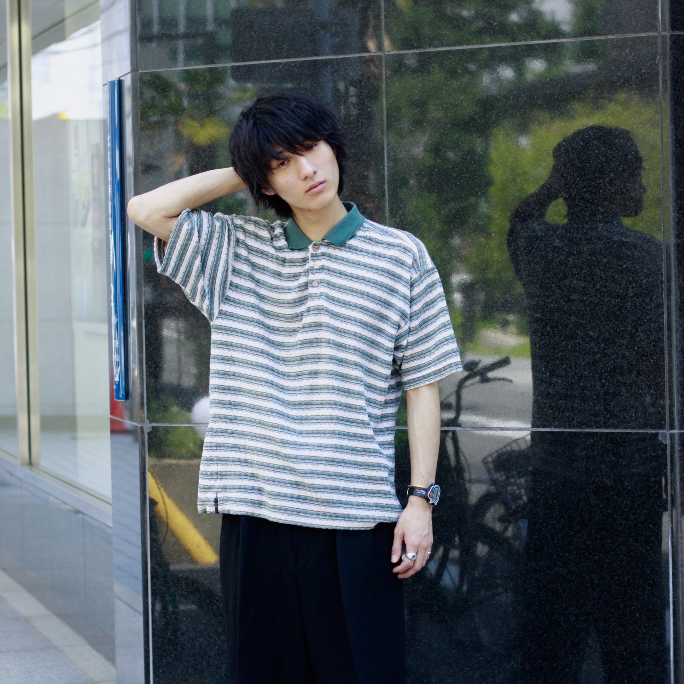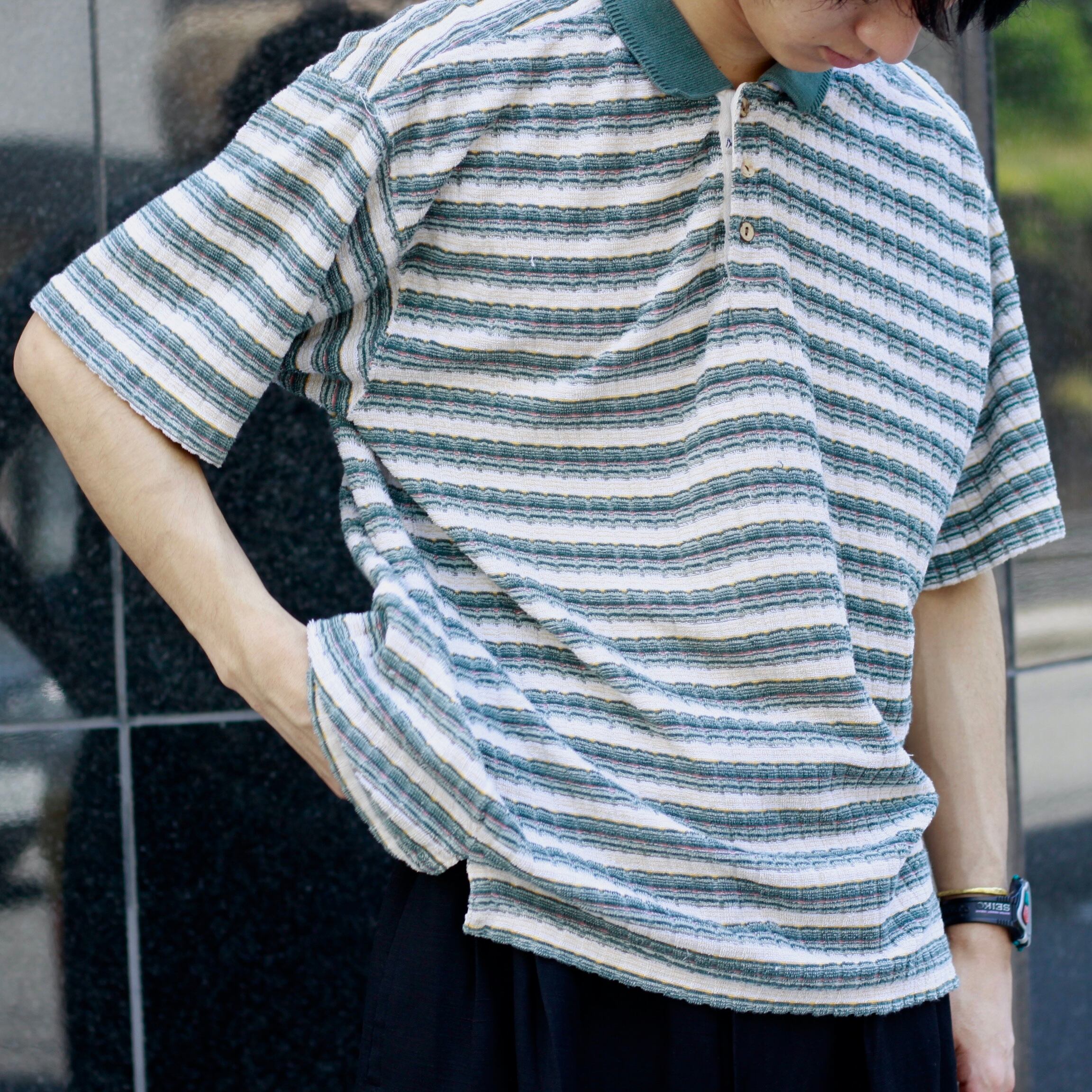 0358. jaquard polo shirt 織りボーダー パイル 半袖ポロシャツ 古着