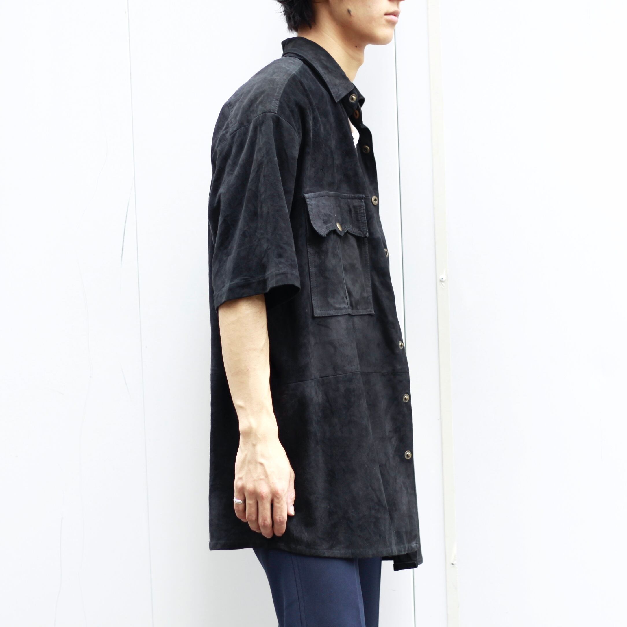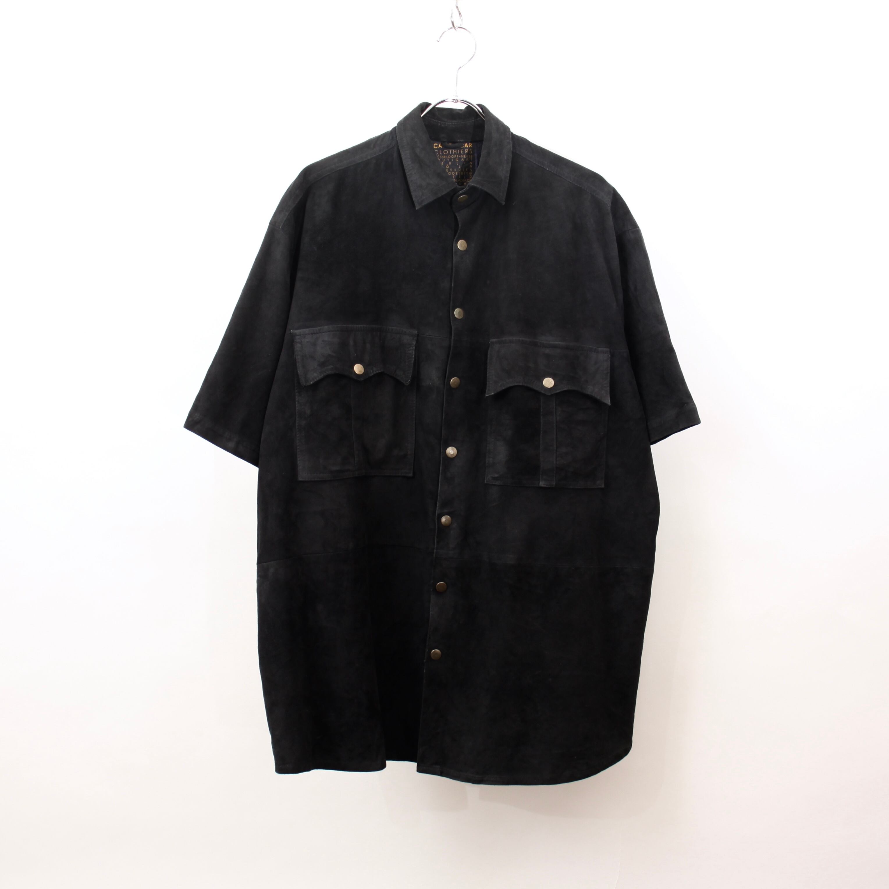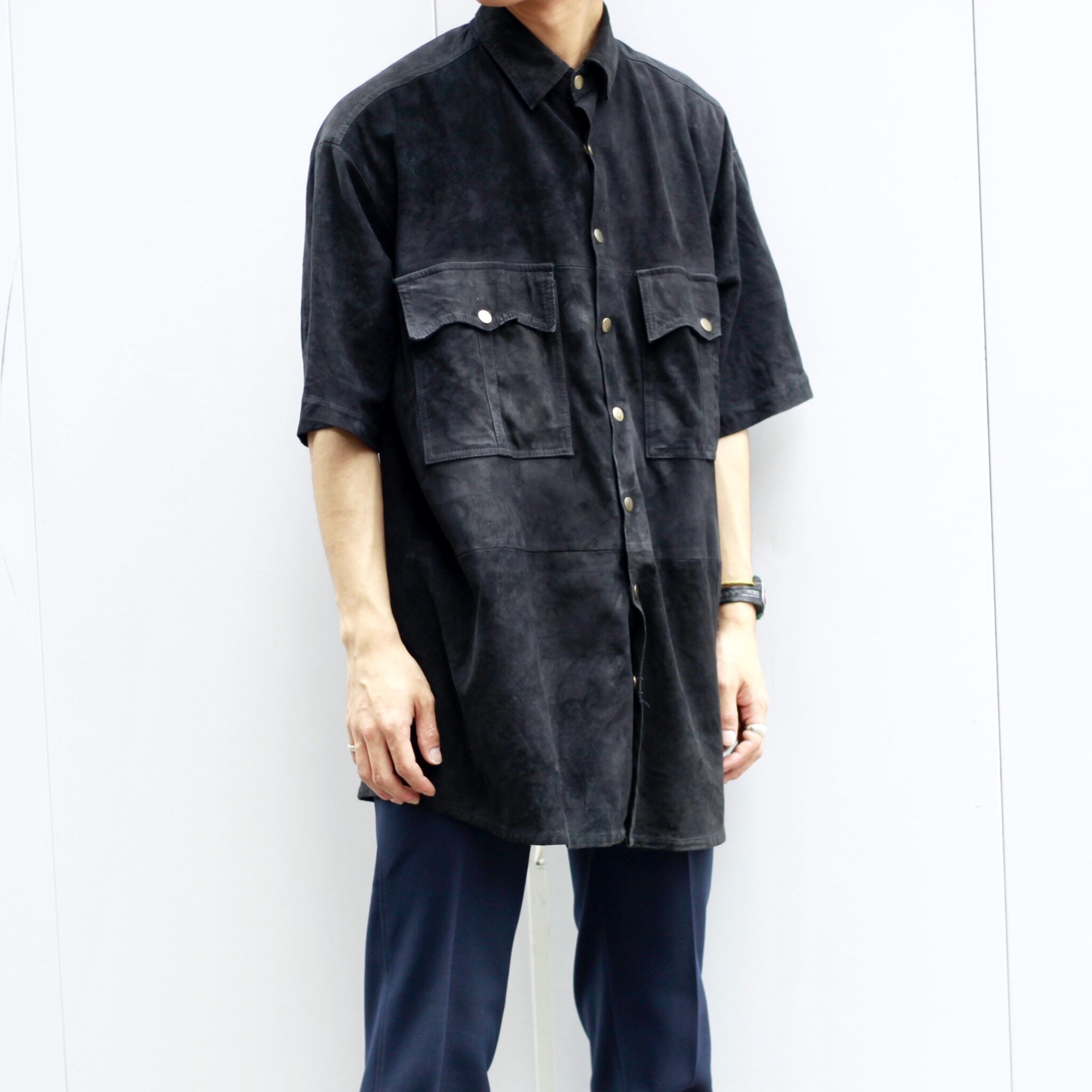 0419. thin suede leather shirt ブラック スエードレザー 半袖シャツ スナップボタン euro vintage ユーロ古着