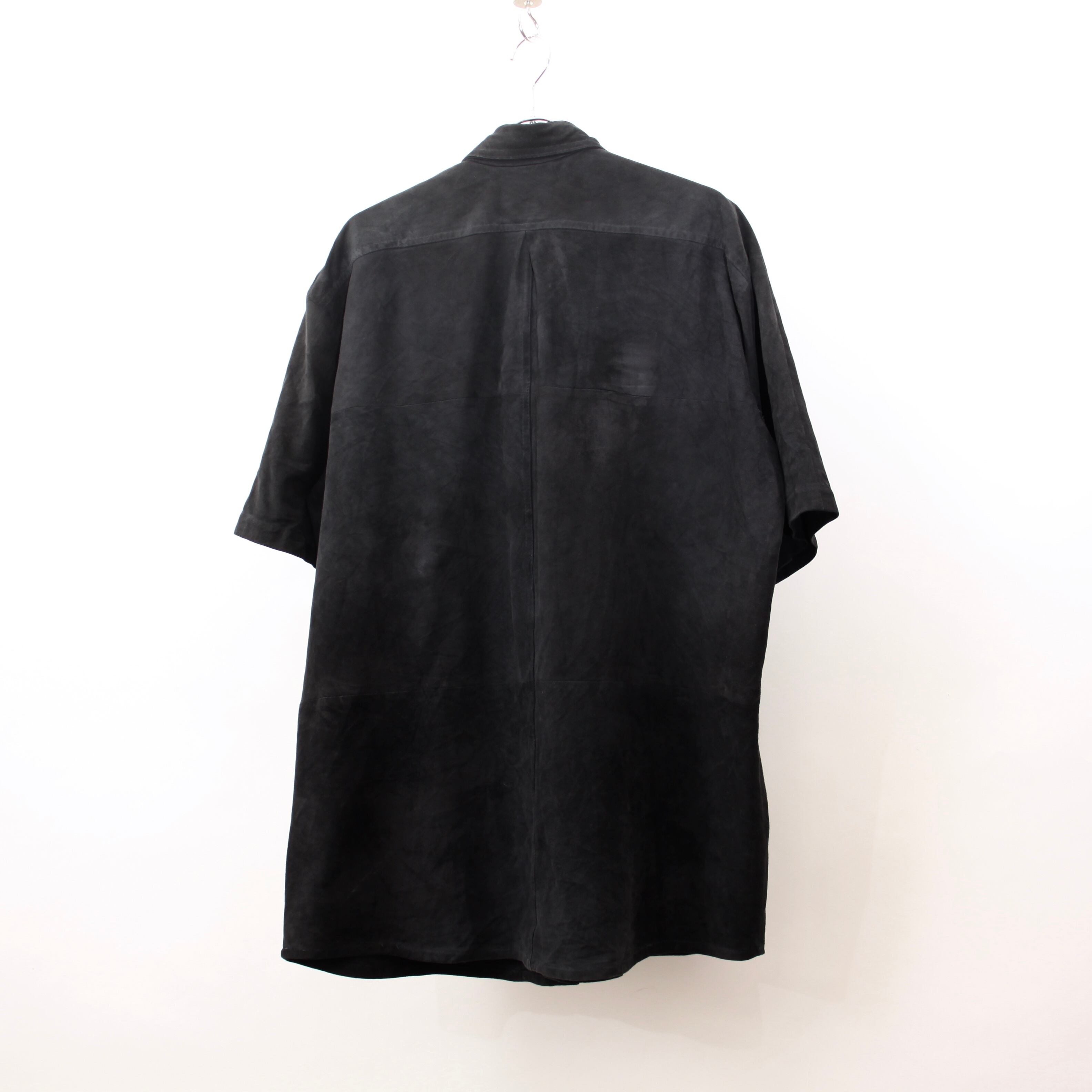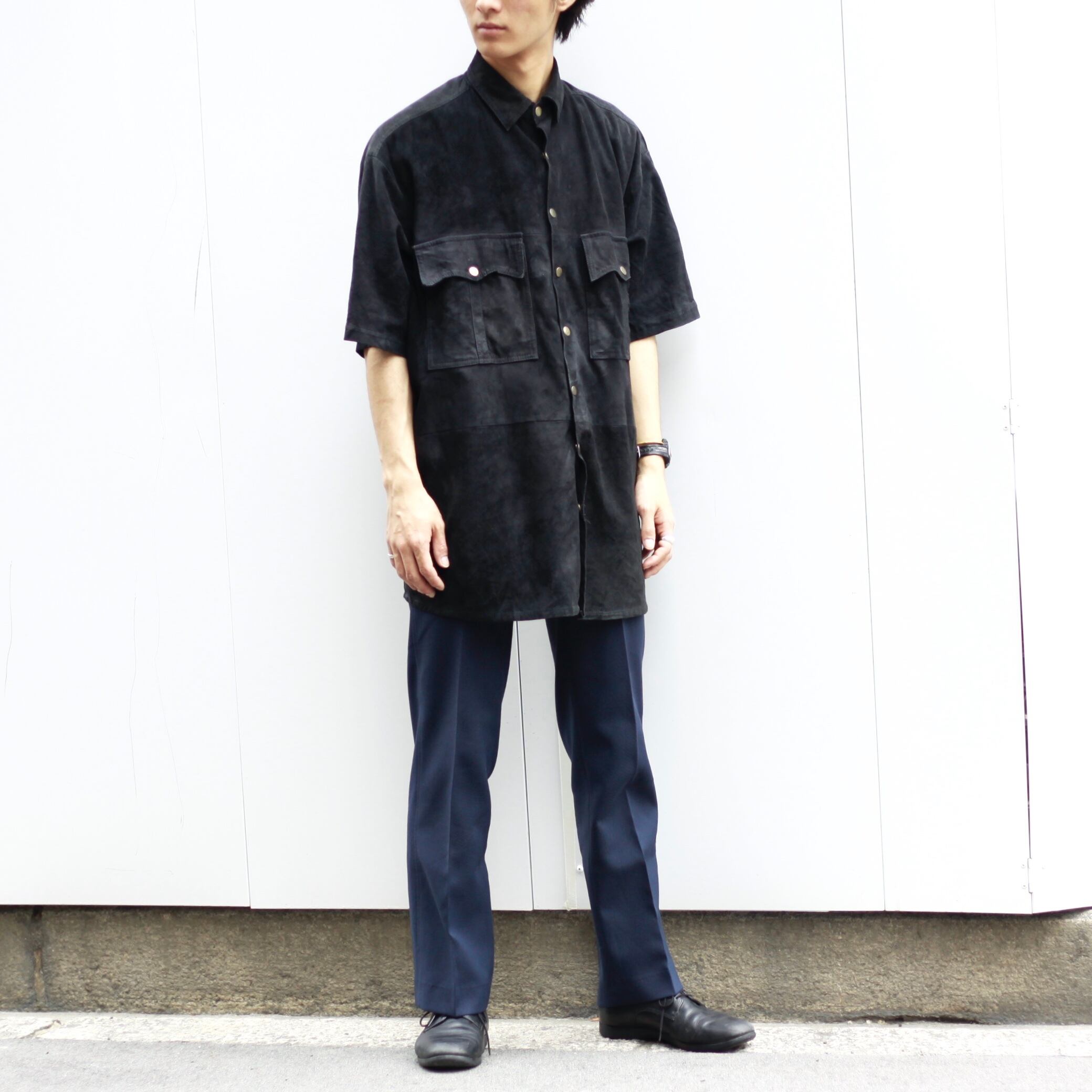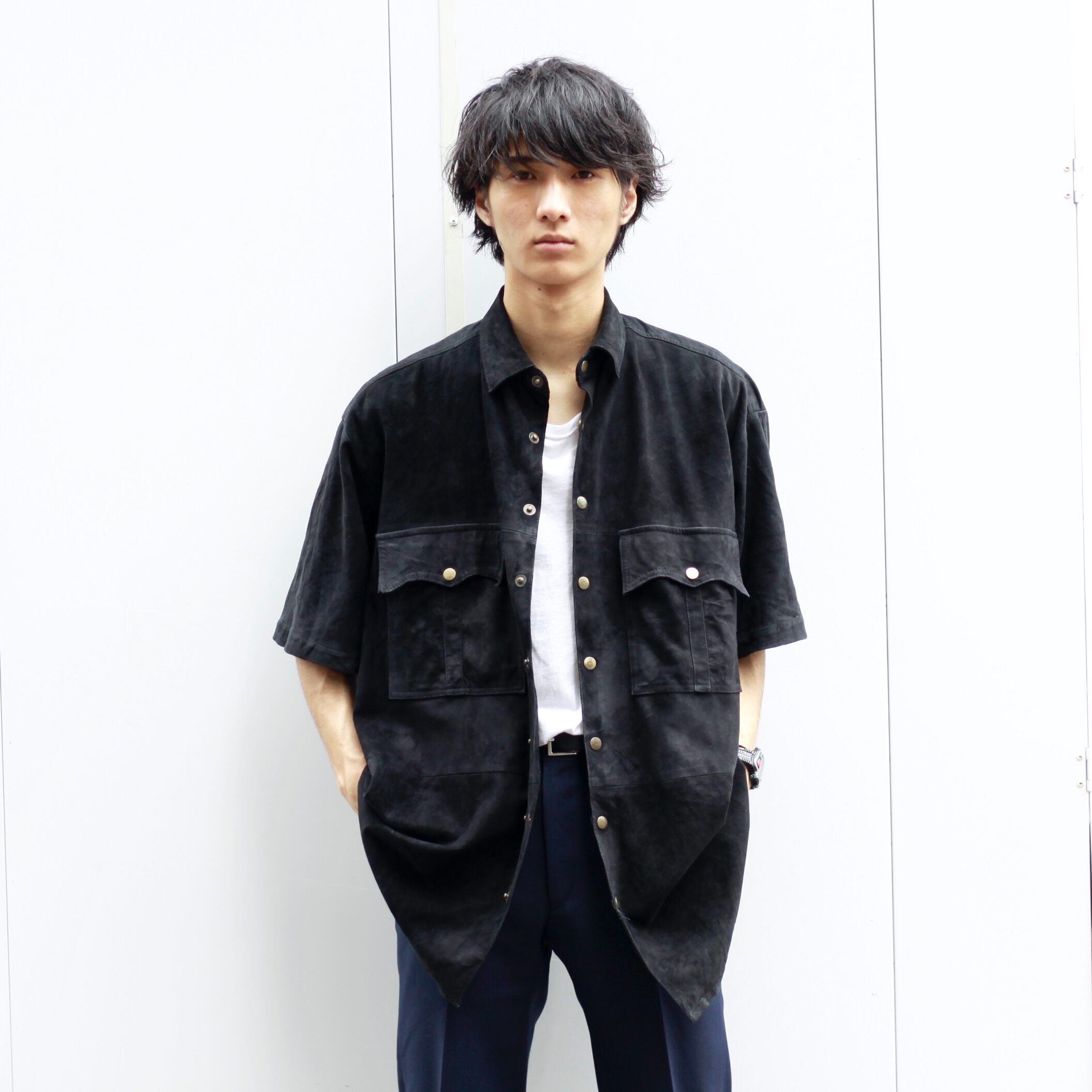 0419. thin suede leather shirt ブラック スエードレザー 半袖シャツ スナップボタン euro vintage ユーロ古着