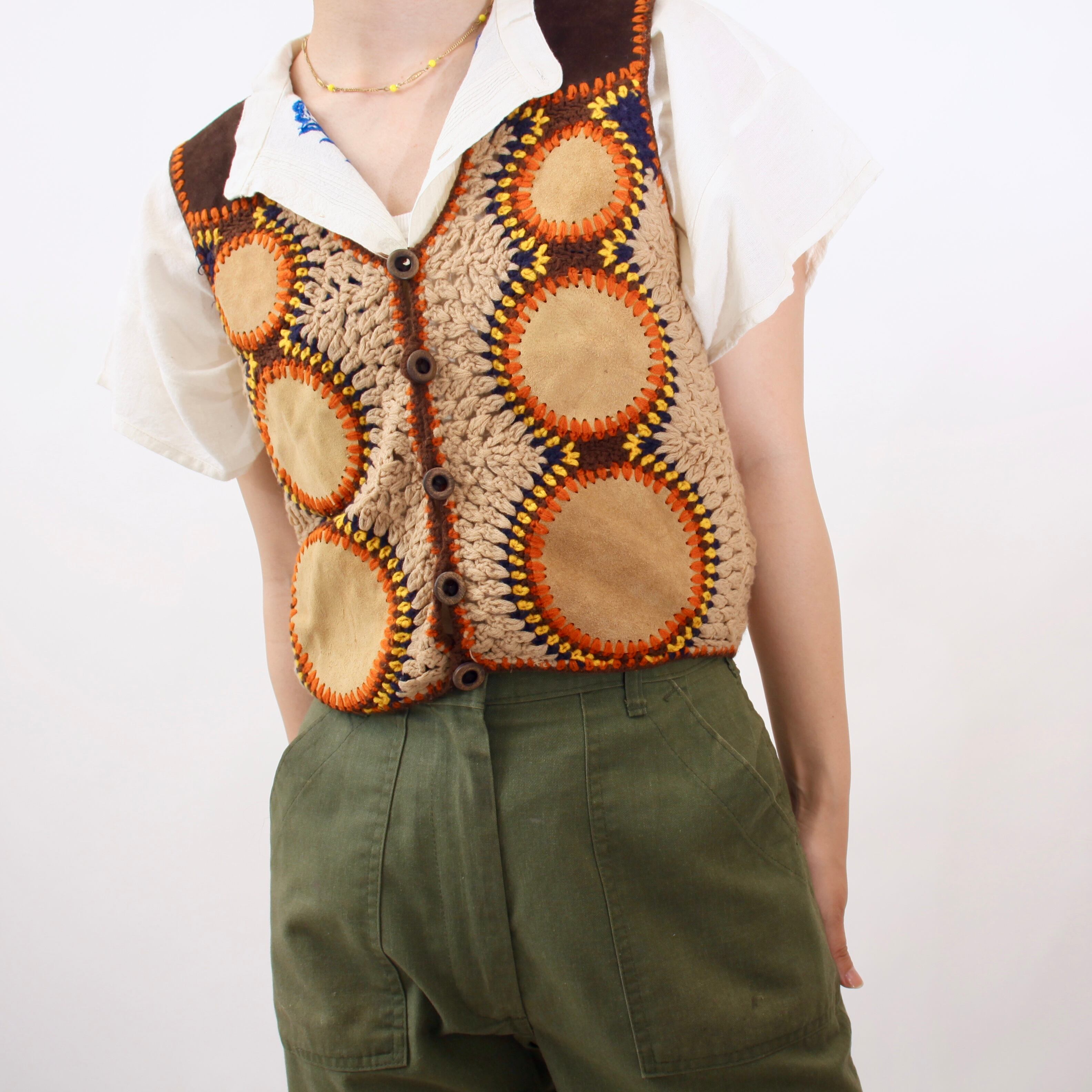 0592. vintage crochet knit vest switching suede leather ベージュ レザー切替 ハンドメイド? クロシェニットベスト フォークロア レディース古着