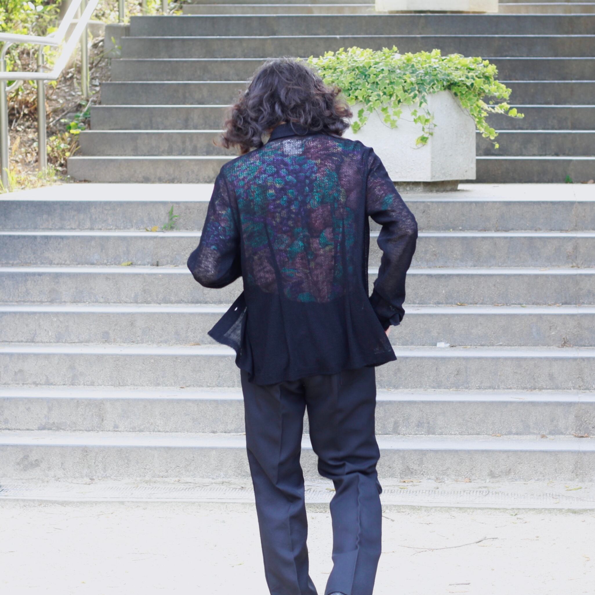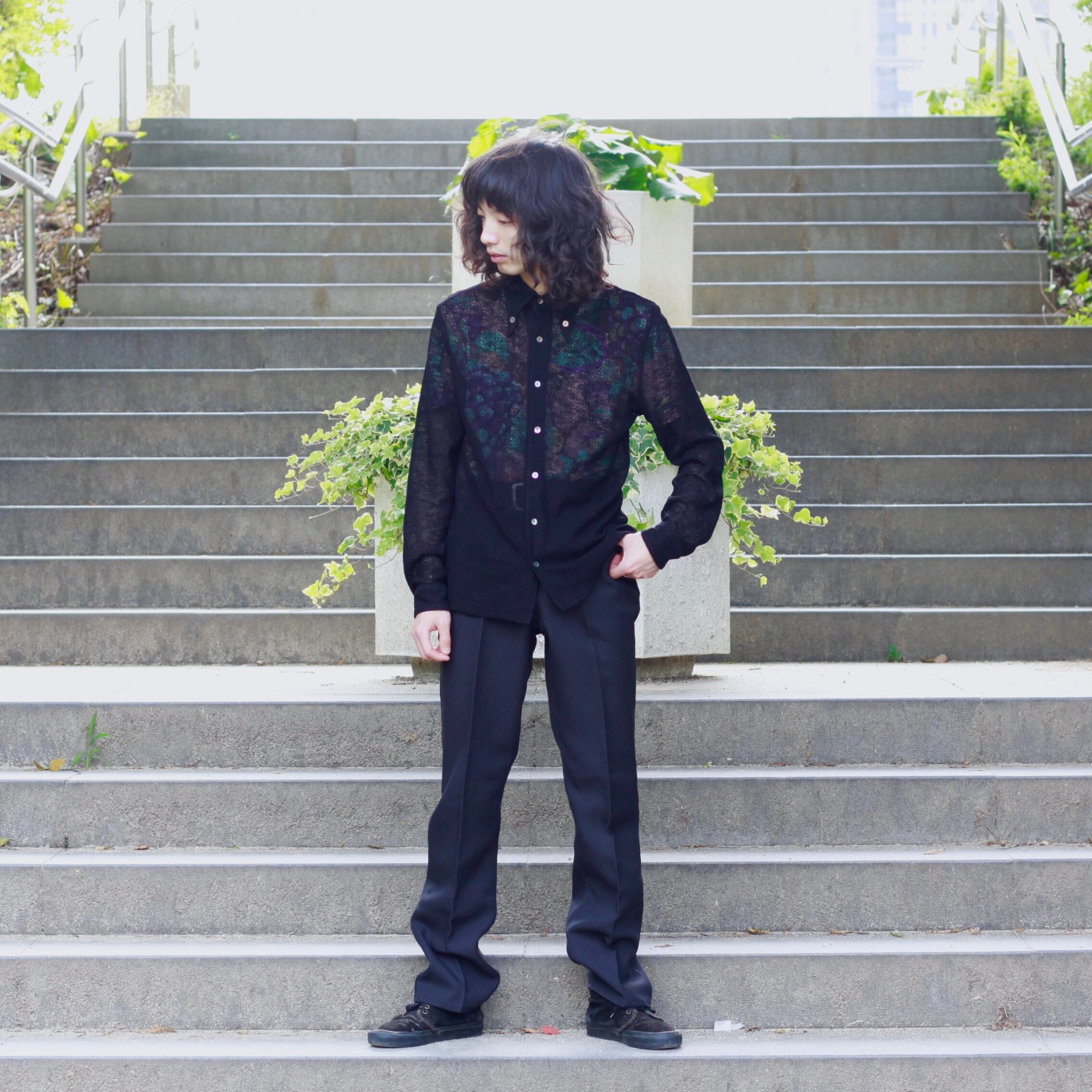 0555. mens see-through shirt ブラック シースルーシャツ 長袖 ロングポイント ボタンダウン 変形 デザイナーズ キャサリンハムネット KATHARINE HAMNETT 古着