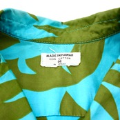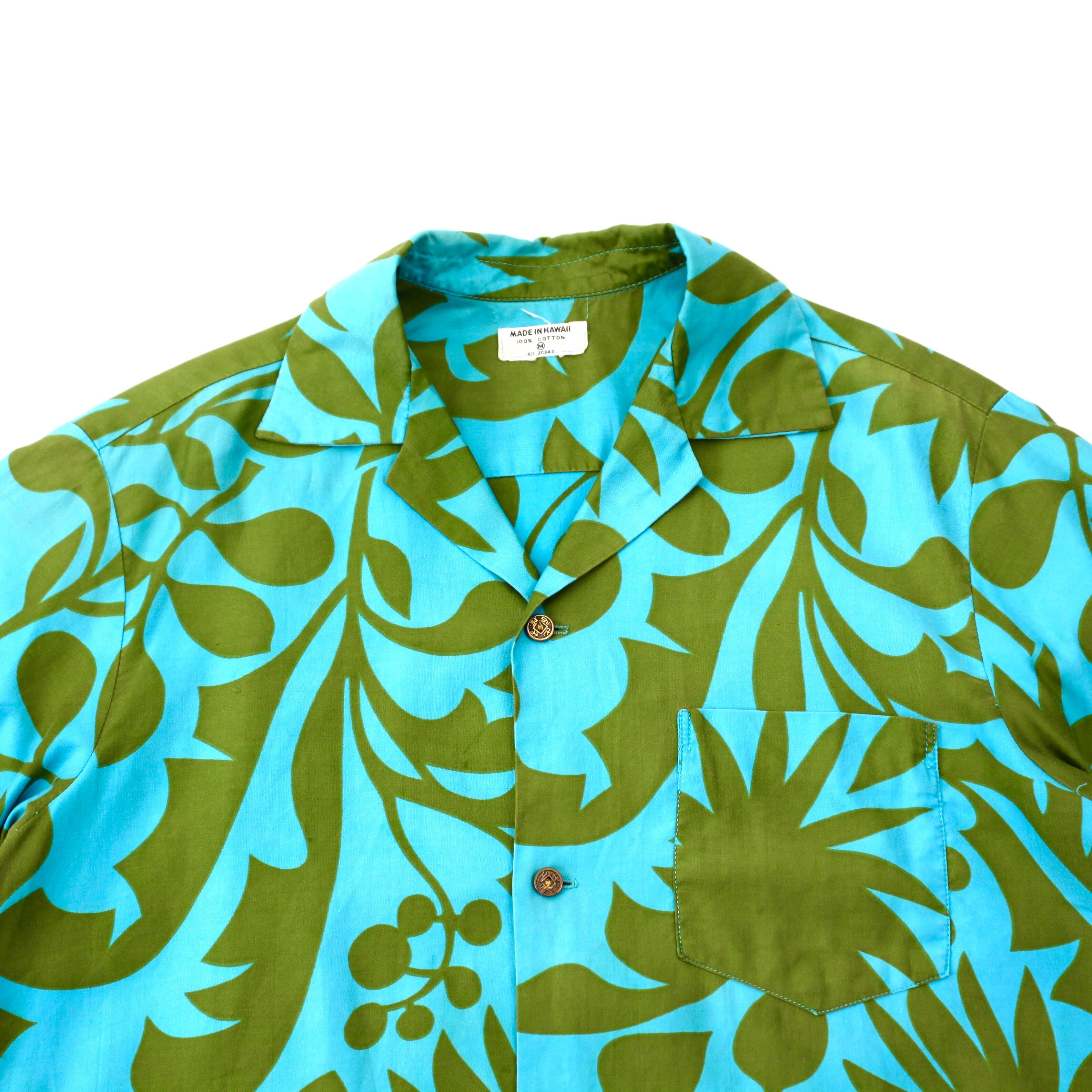0578. 1960's cotton Hawaiian shirt 総柄 グリーン ブルー コットンアロハ 半袖シャツ 開襟 オープンカラー 古銭ボタン ビンテージハワイアン レジャーシャツ バティック made in HAWAII 60s 60年代 RN20942 vintage aloha 古着