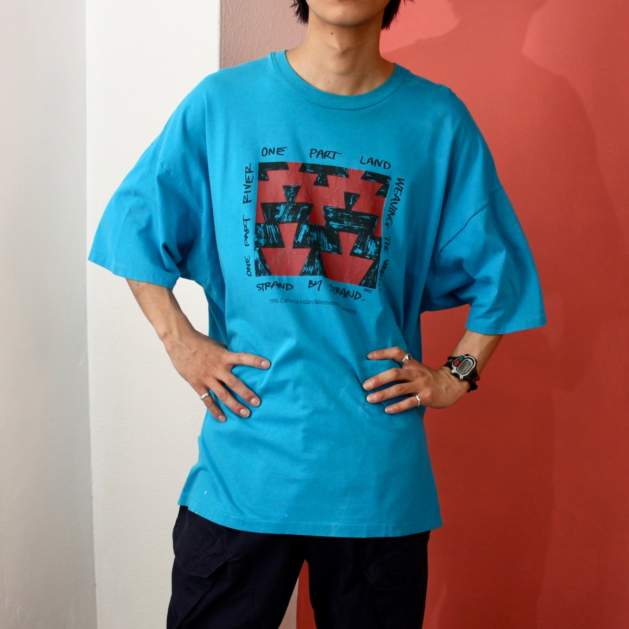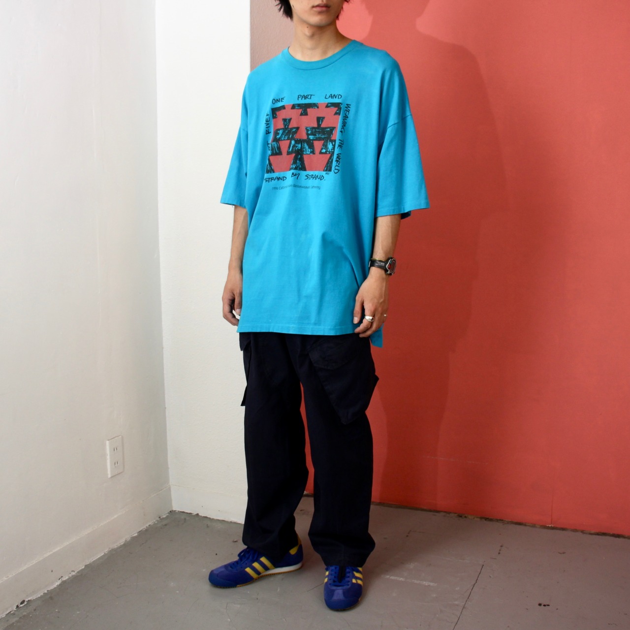 0608. 1990's basket weavers tee ブルー グラフィックアート プリント Tシャツ ヘインズ 90s 90年代 vintage hanes BEEFY-T XXXL 3XL 古着
