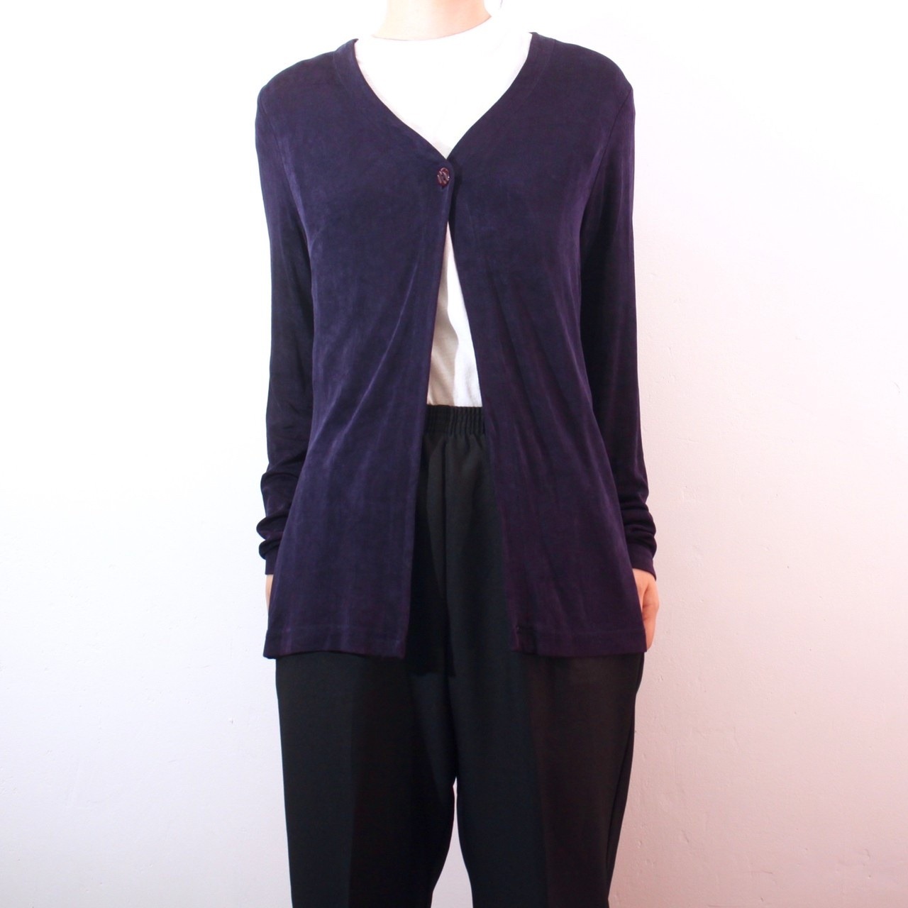 0641. meaty cotton/poly 1 button cardigan ネイビー 1ボタン カーディガン レディース古着