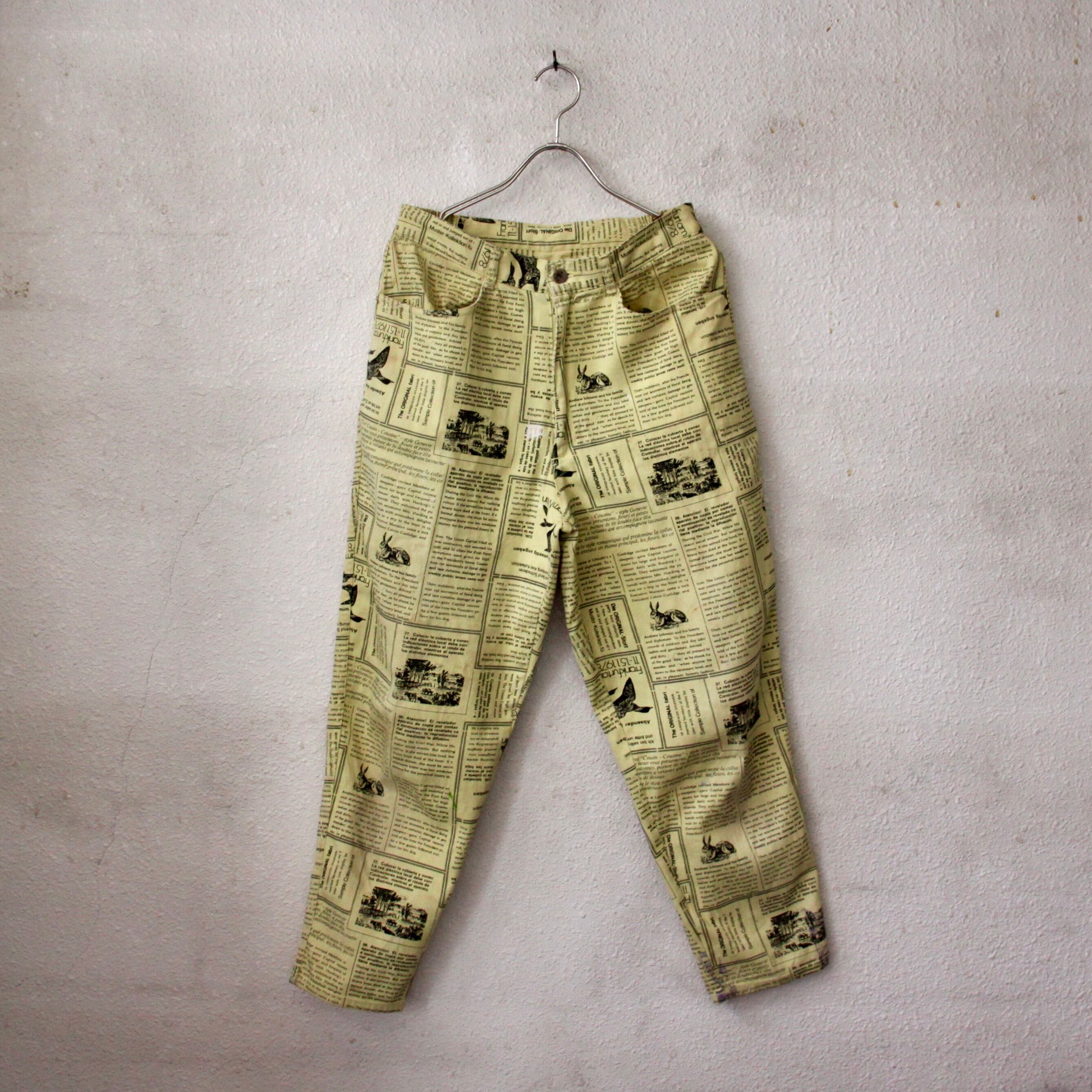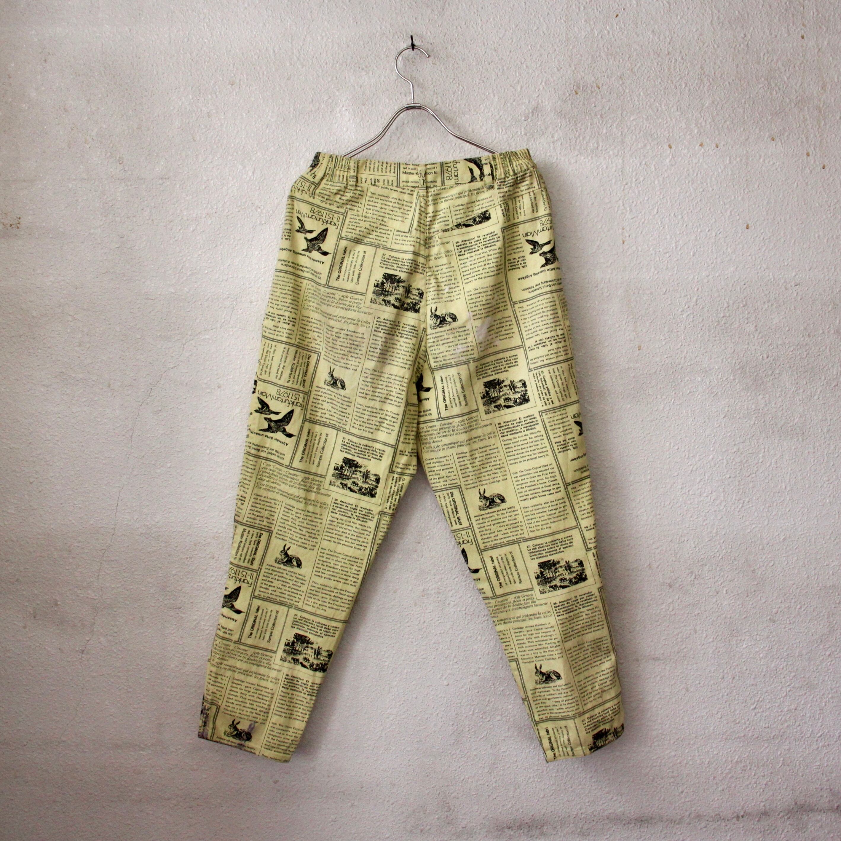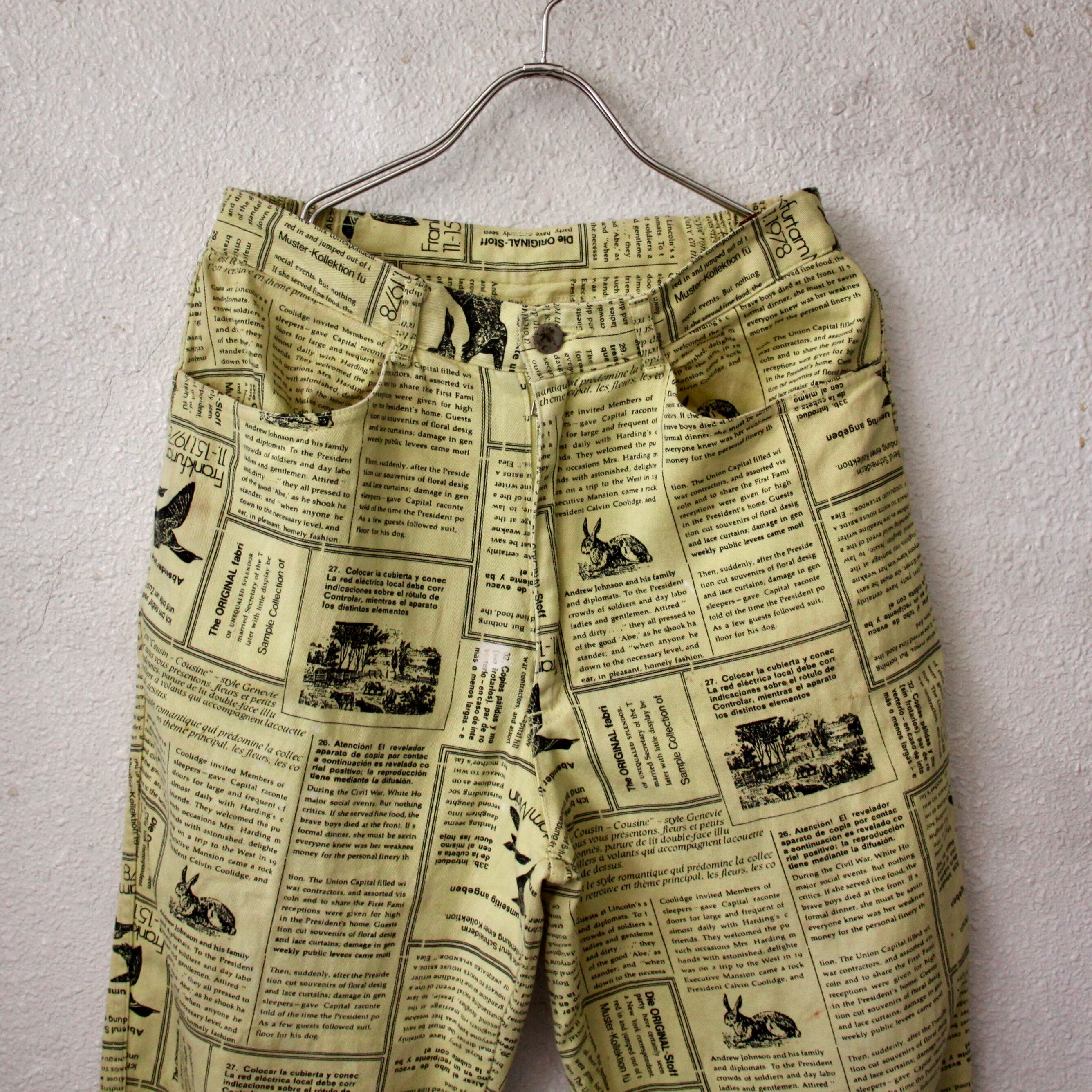 0645. 1990's german brand text printed pants スモーキーイエロー 総柄 ニュースペーパー ドイツ 90s 90年代 vintage ヴィンテージ 古着