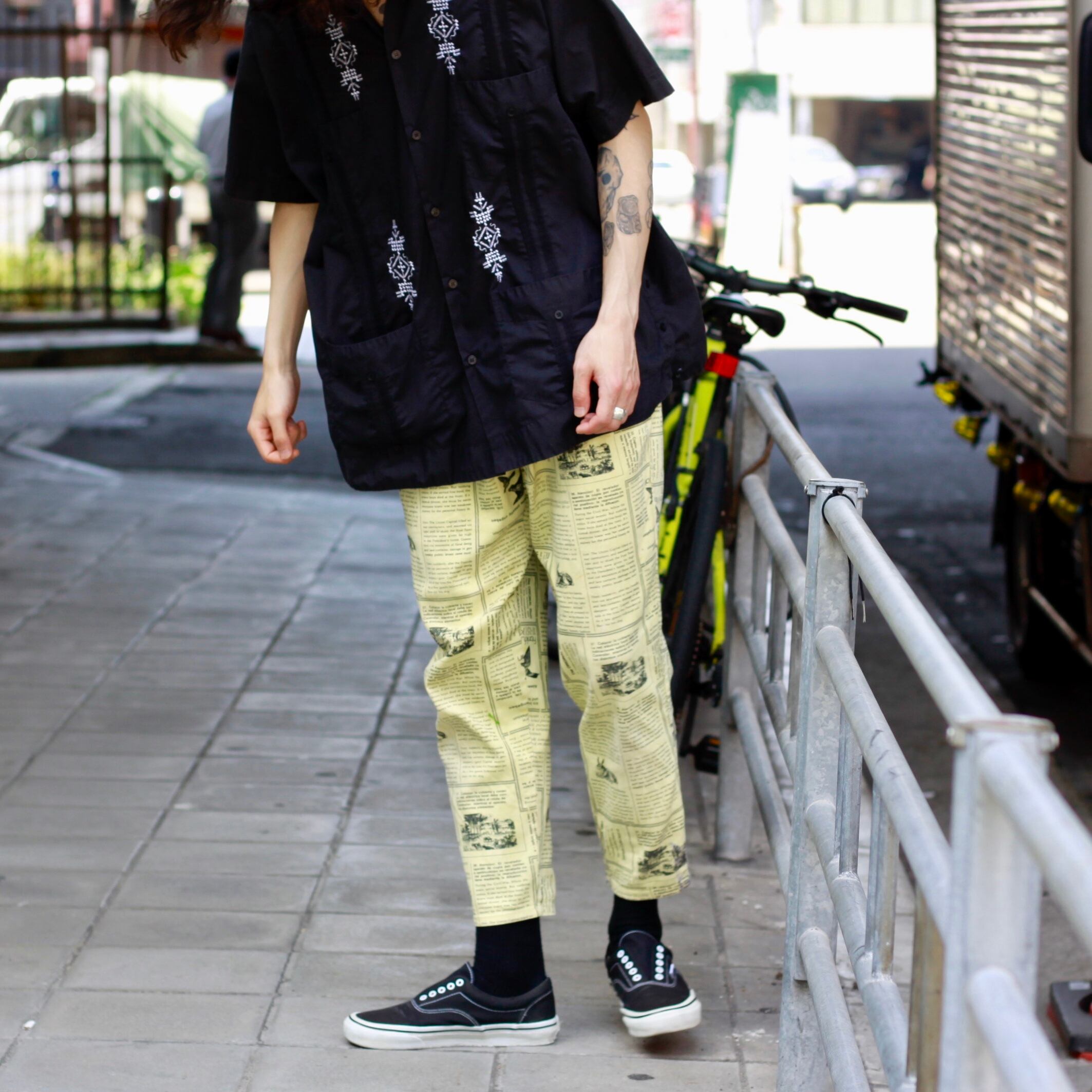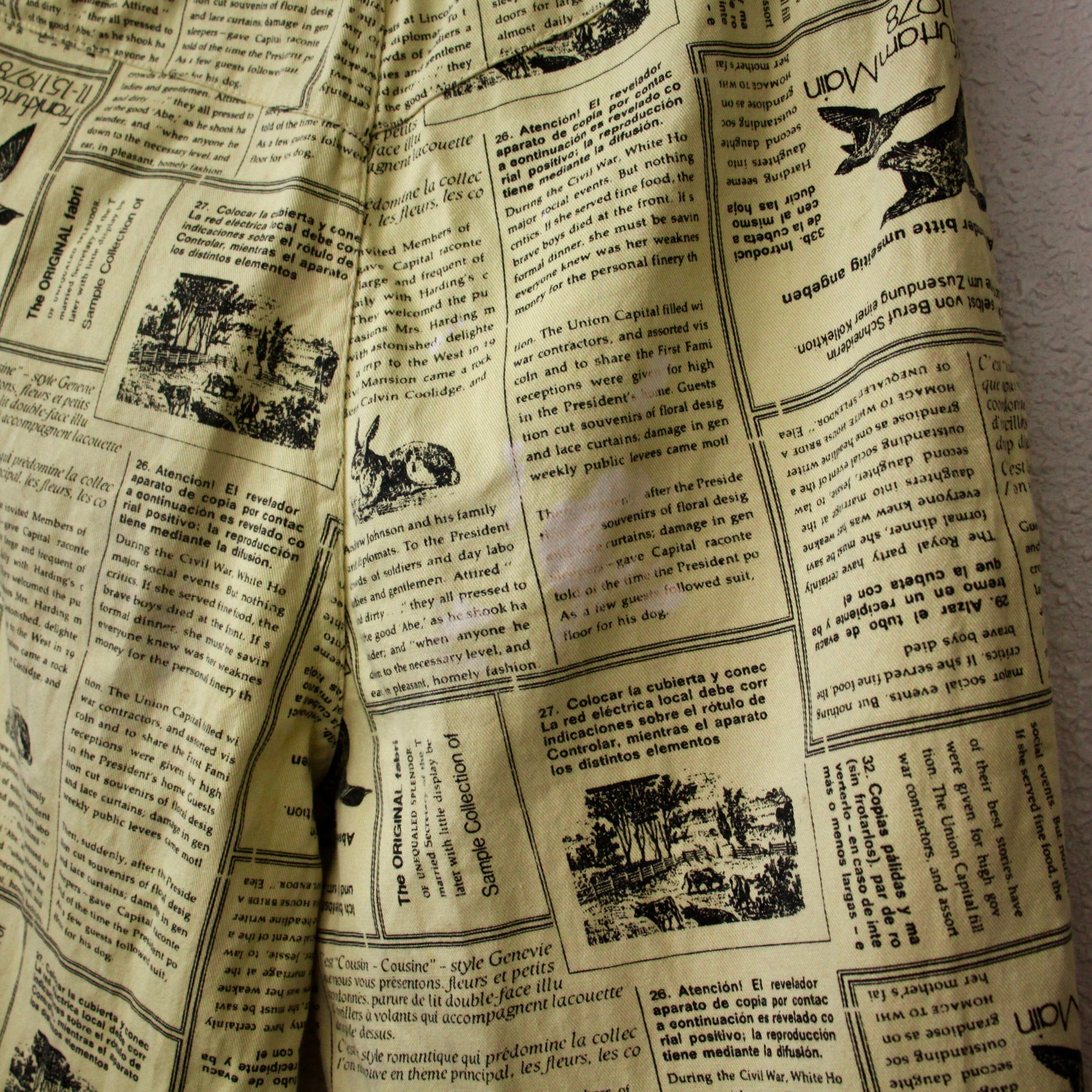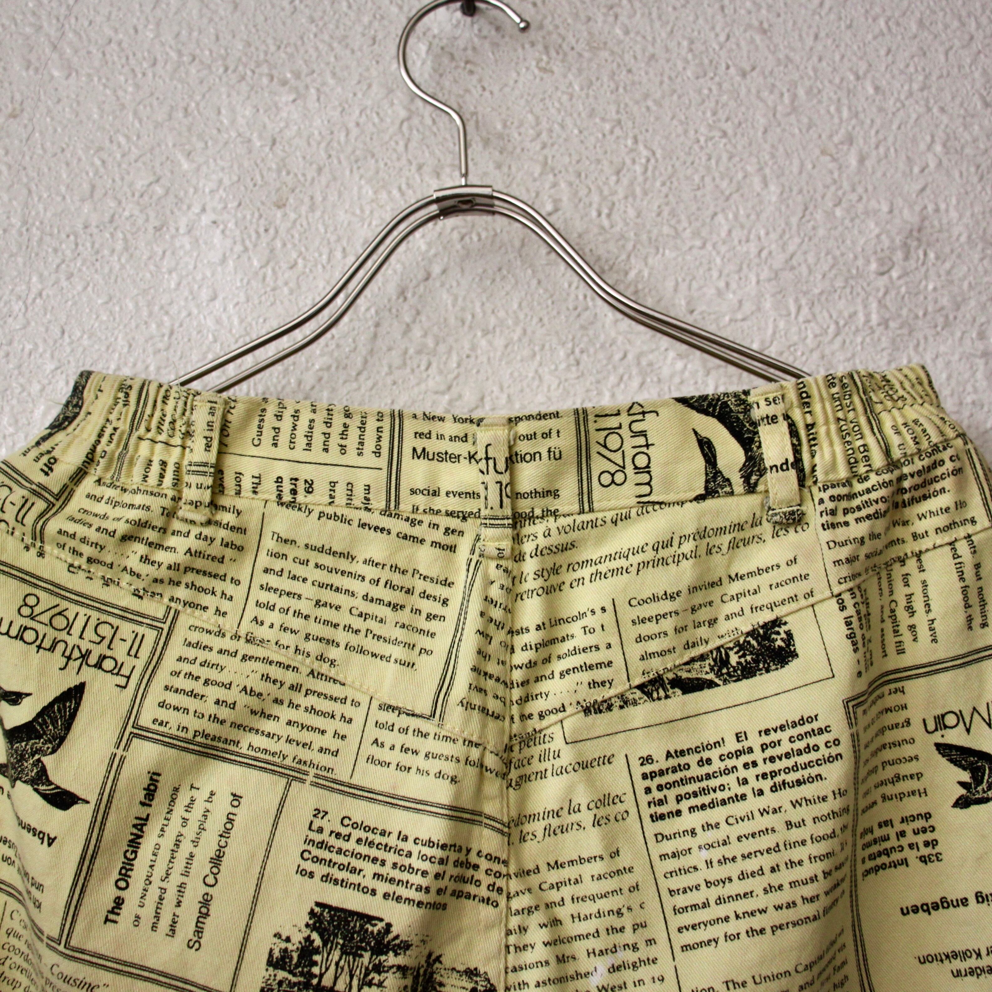 0645. 1990's german brand text printed pants スモーキーイエロー 総柄 ニュースペーパー ドイツ 90s 90年代 vintage ヴィンテージ 古着
