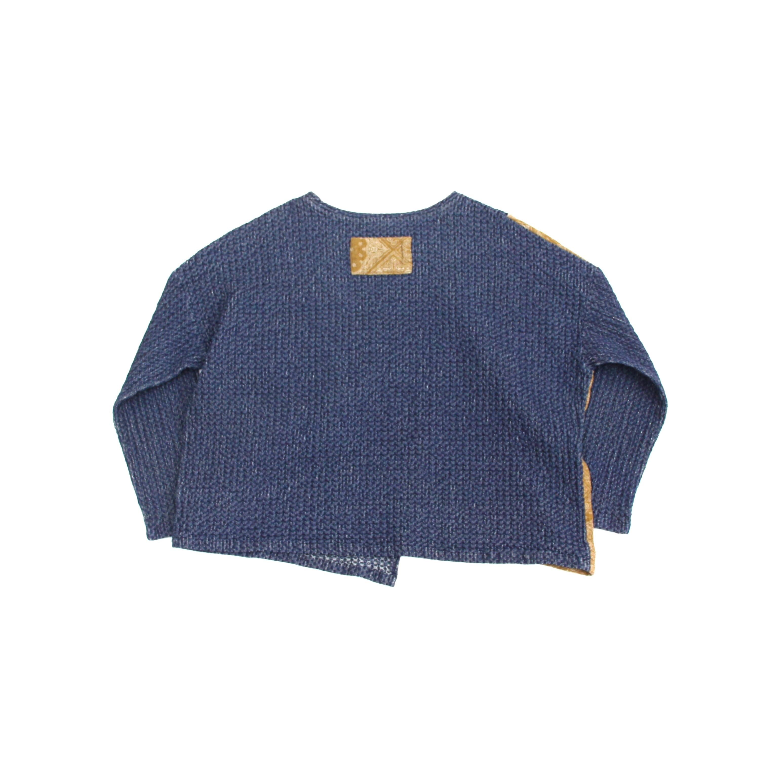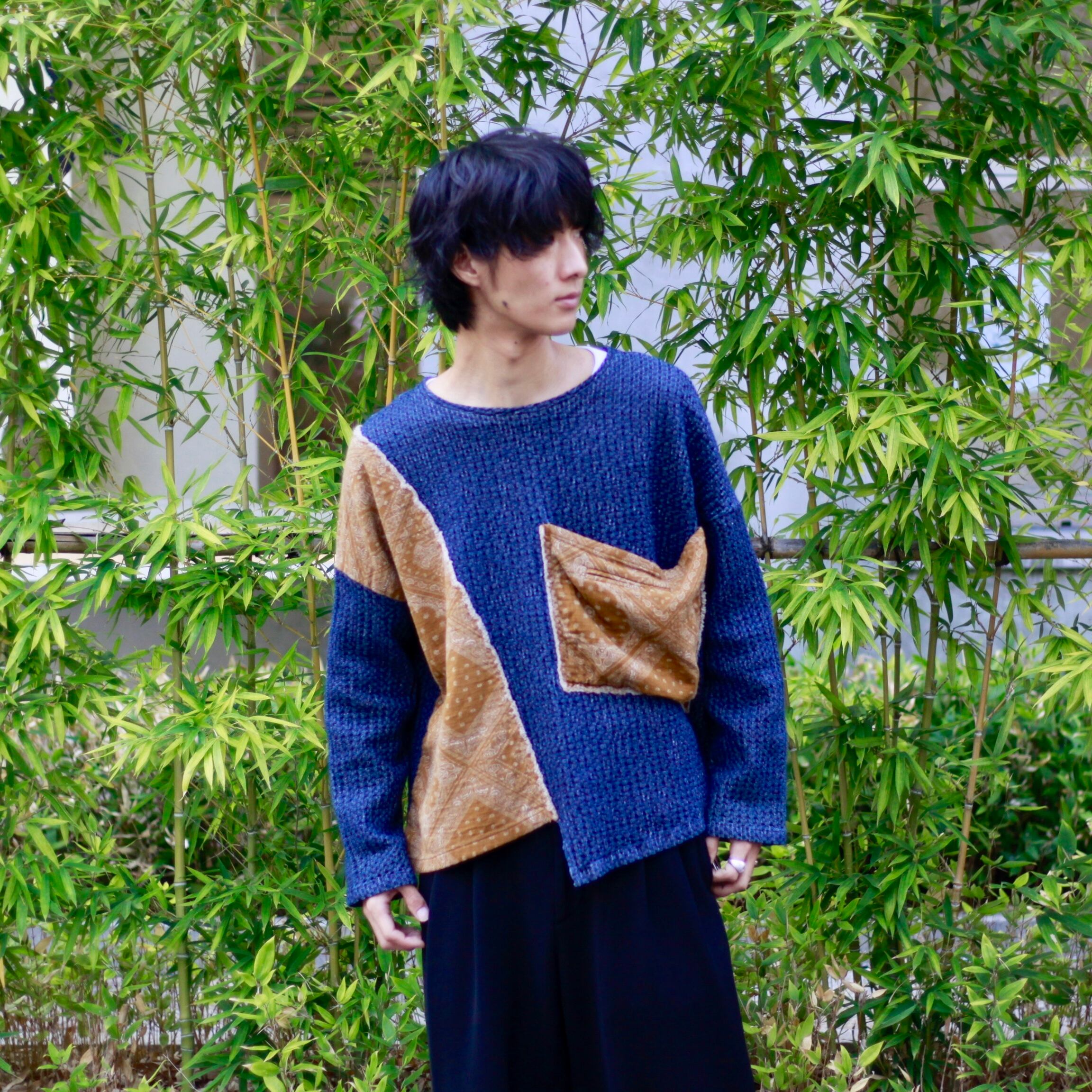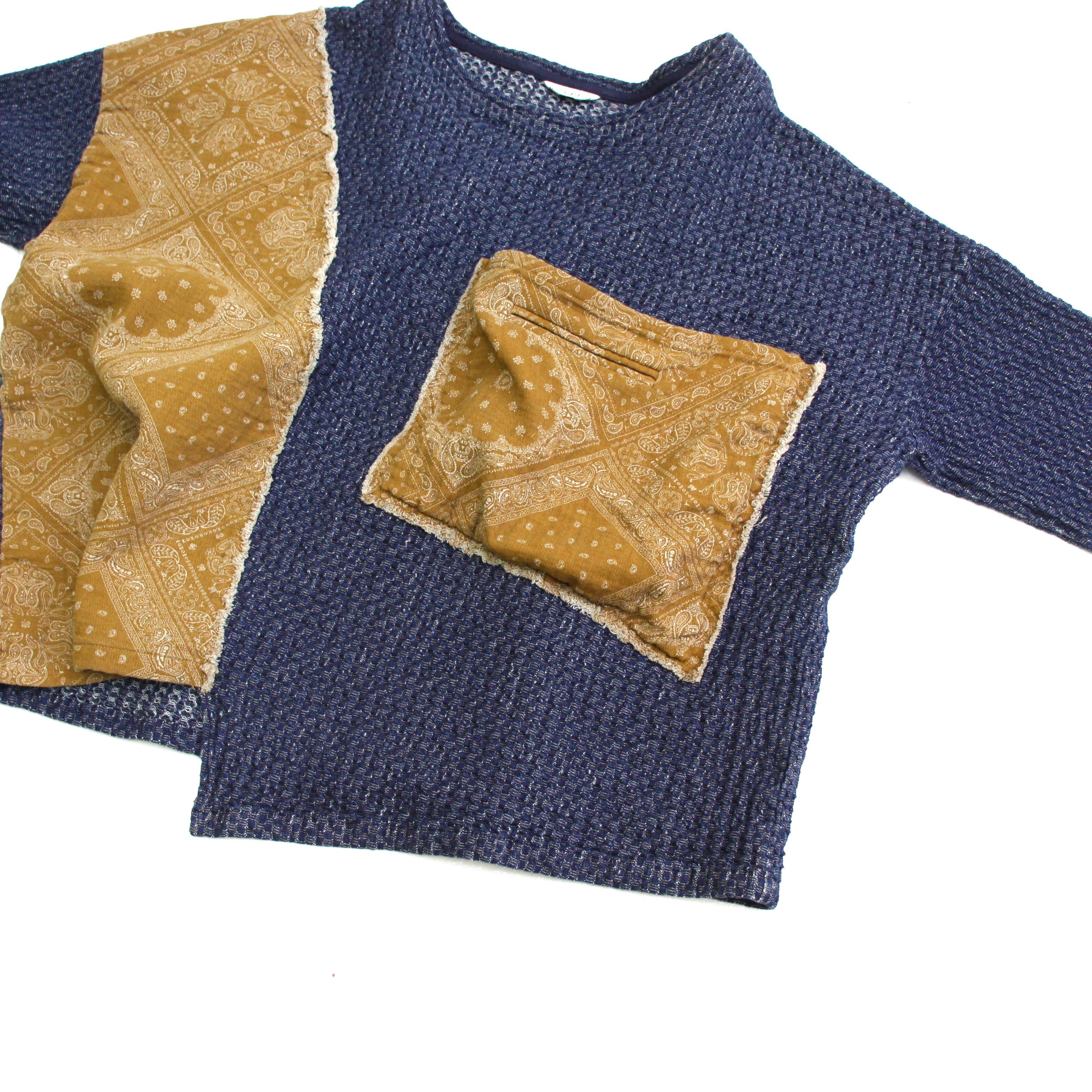 0162 / indigo dyed cotton/poly pullover インディゴ 切替 長袖ニット バンダナ ボートネック 古着