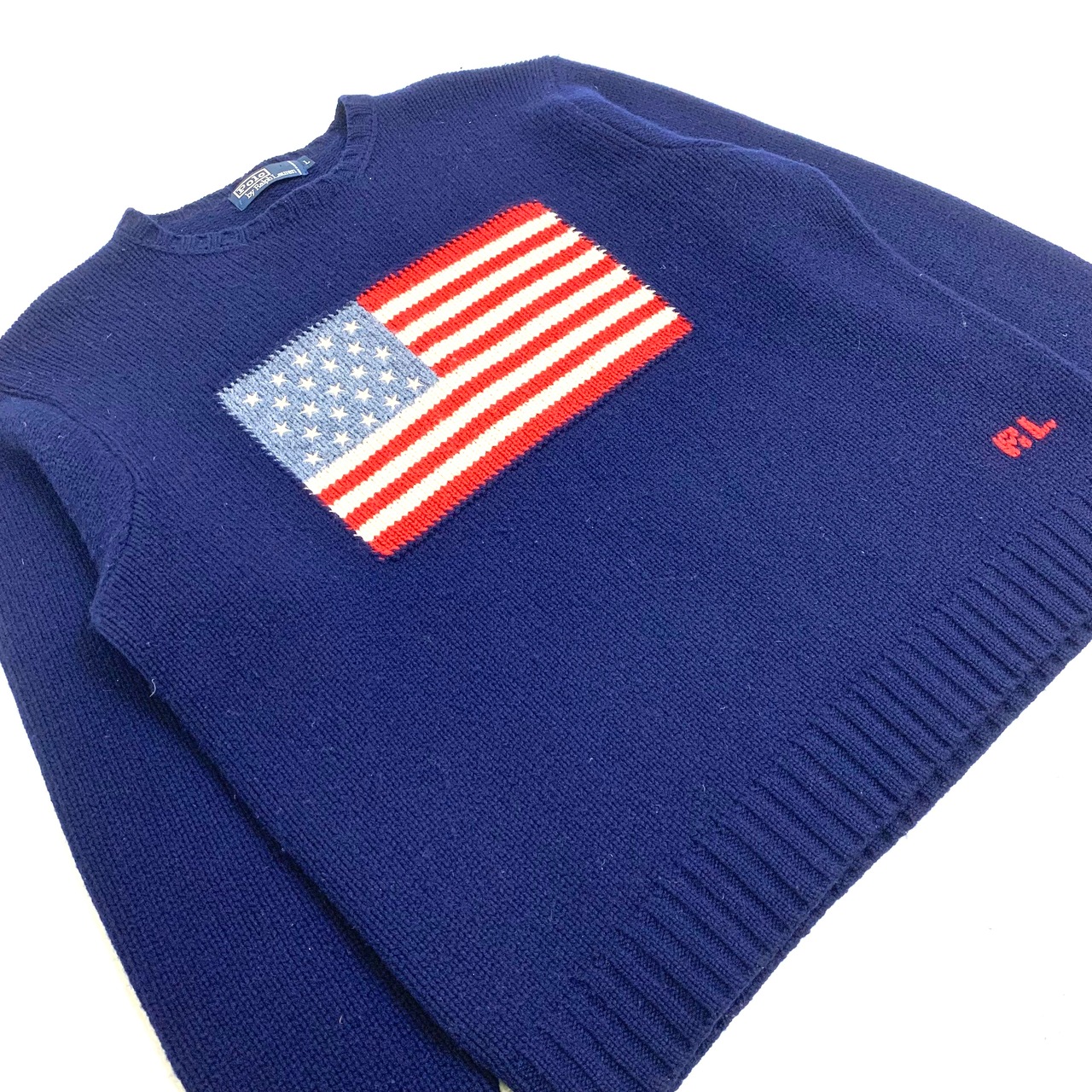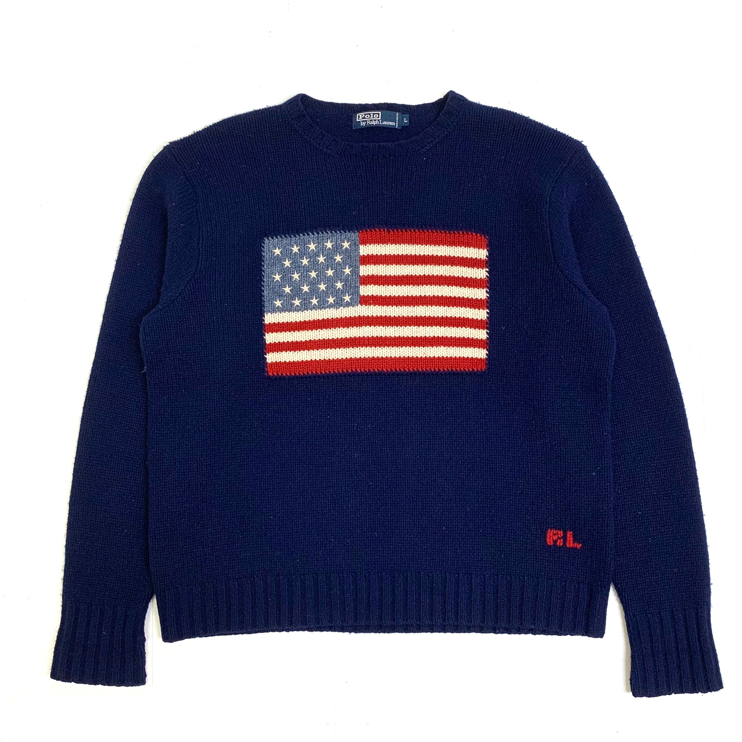 0227 / 1990's RL American flag sweater ネイビー アメリカ国旗 星条旗 ラムウール ニット セーター ポロ ラルフローレン 90s 90年代 euro vintage Polo by Ralph Lauren 古着