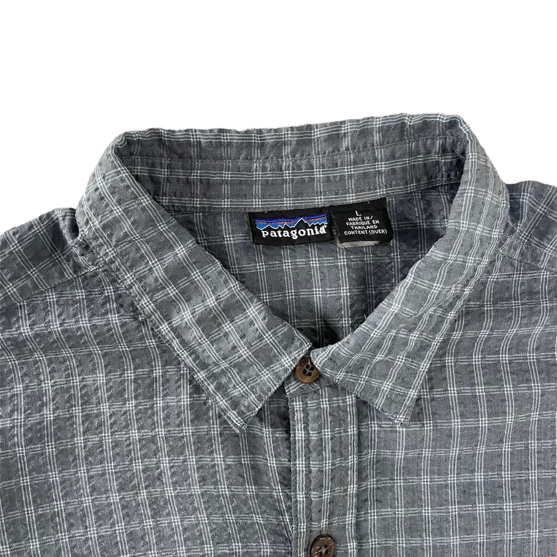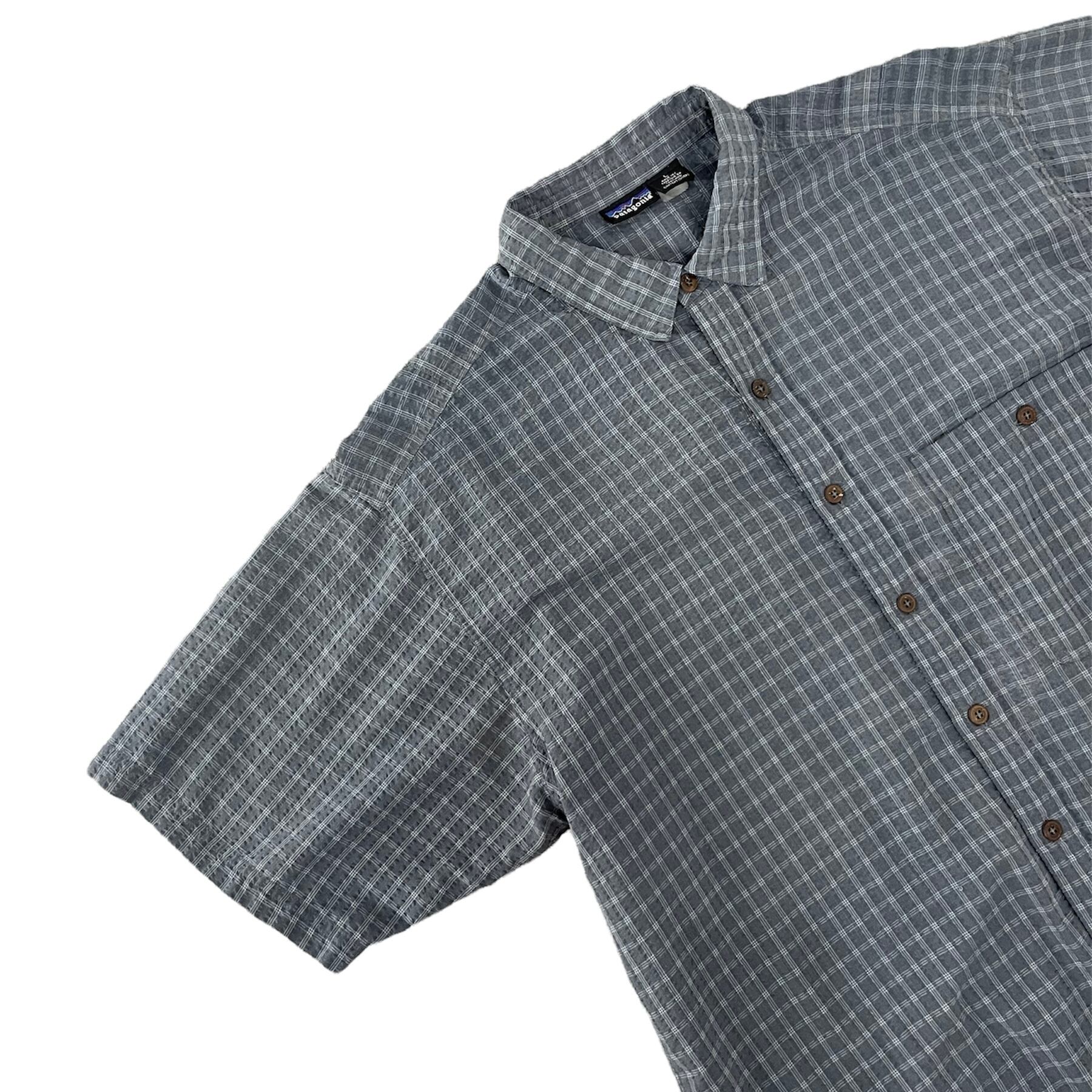 1063. 1990's Patagonia seersucker plaid shirt ネイビー チェック シアサッカー 半袖 ボックスシャツ コットン 表記L 90s 90年代 パタゴニア US古着