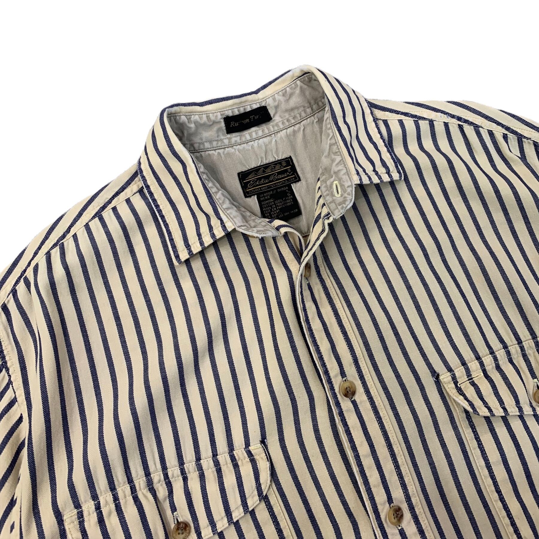 1213. 90's Eddie Bauer 半袖シャツ イエロー×ネイビー ストライプ L 90年代 黒タグ